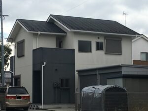 全体の完成写真です。外壁塗装はモルタル壁と写真左側の焼板も塗装しています。