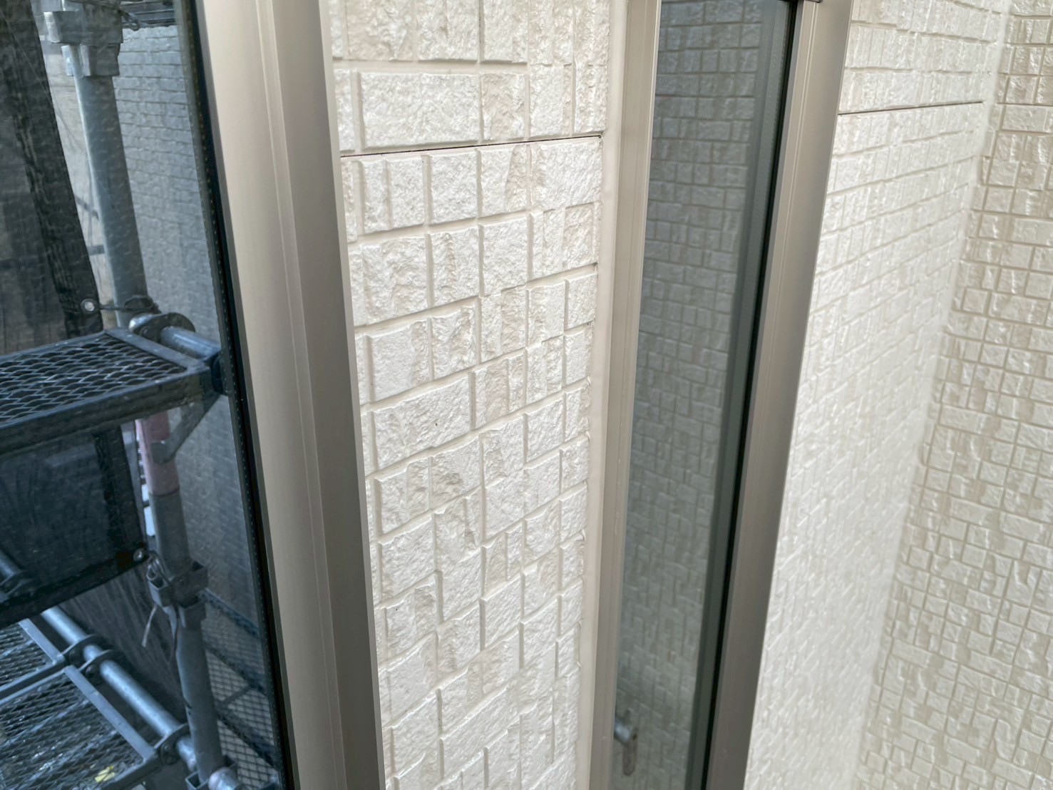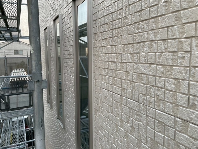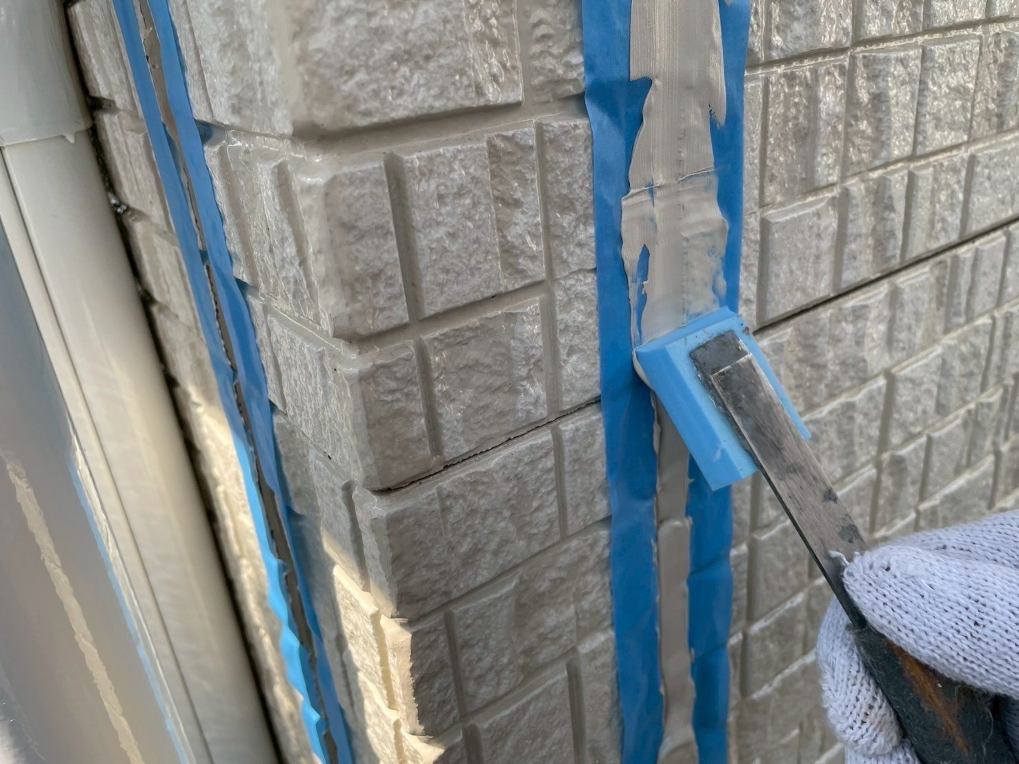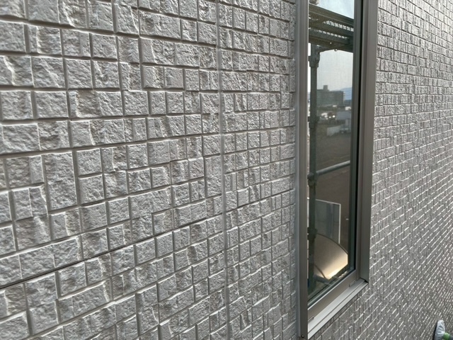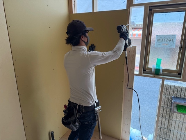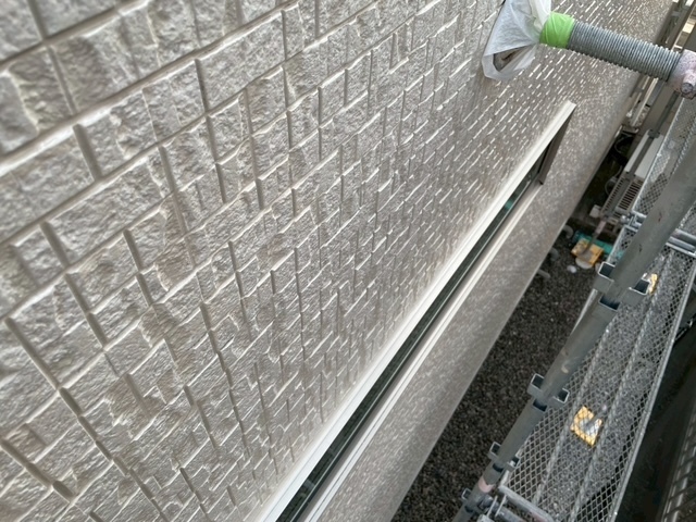 外壁がフッ素のクリアーでしたのでメーカーに同色に近い色を作ってもらい本日からオートンイクシード剤で仕上げ打設工事をしております。半分残ったので明日も引き続き宜しくお願いしますね(^^)