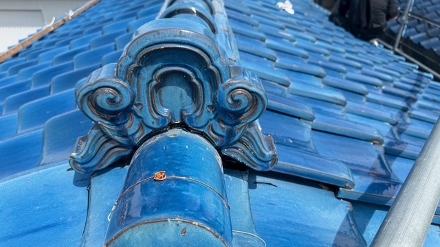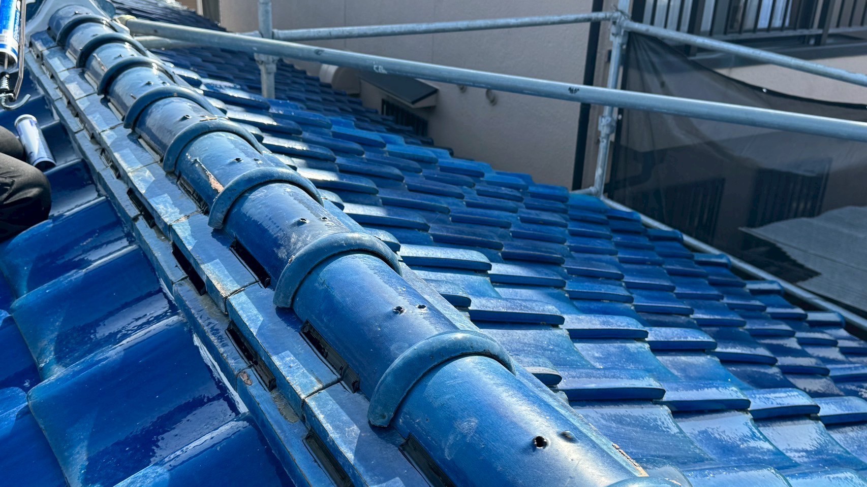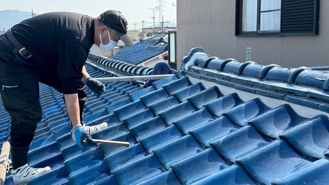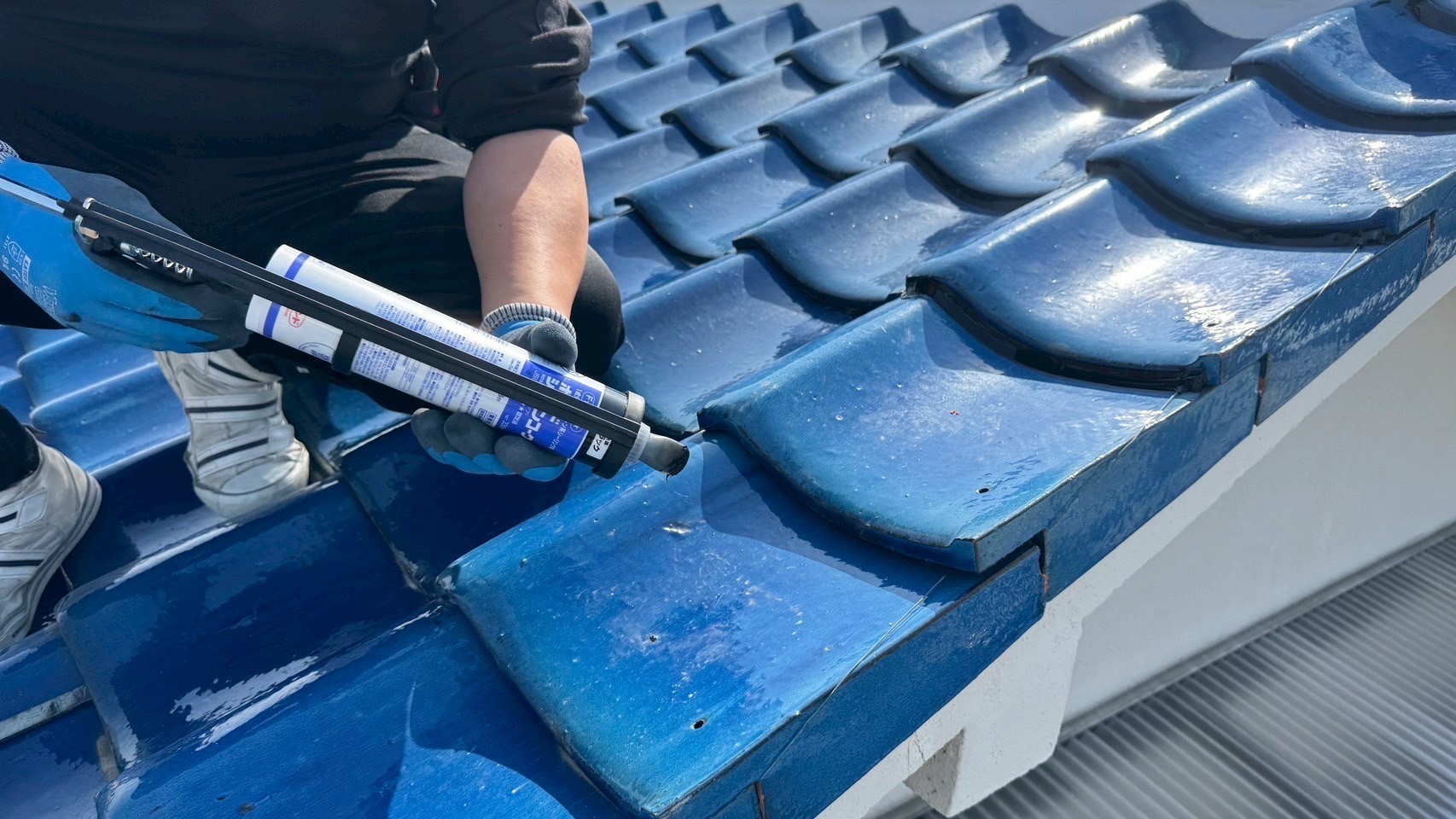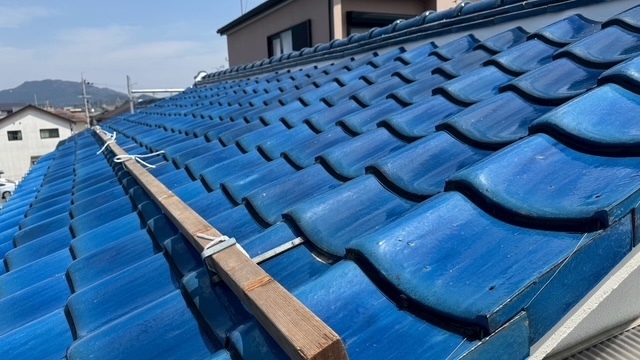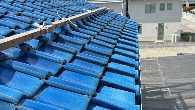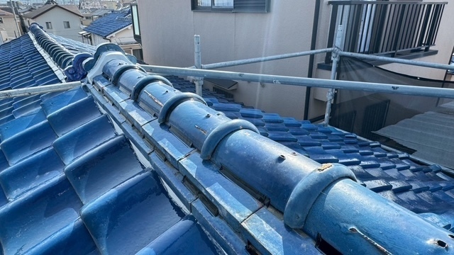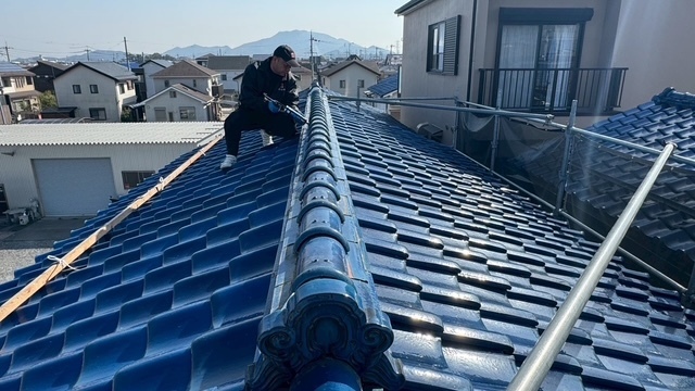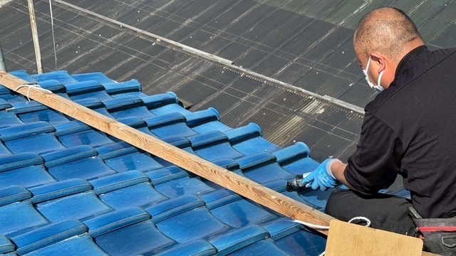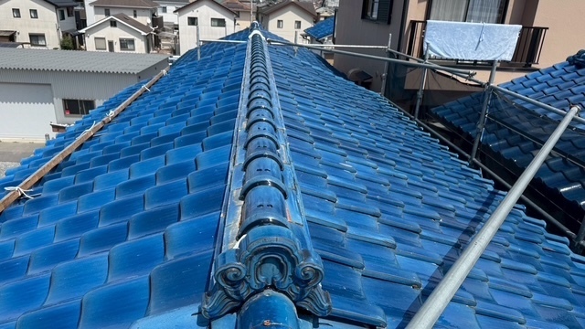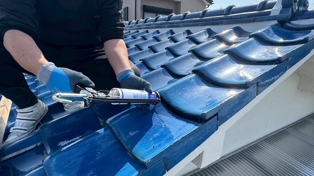 本日の作業は、大屋根の瓦の勾配が4寸5部に満たないので豪雨の時は、雨が差し込んで2階の天井2部屋から雨漏れがするとの事でした。私的には葺き替えも提案しましたが足場の組み立てもできない箇所もありましたのでお客さんの予算のご都合もおありでしたので、何とか葺き替えせずに雨漏れを止めてほしいと相談されたんで、本棟は積み替えたので問題ありません。残りの地瓦、役物瓦は瓦用のシール剤で全面に縦、横を隙間なく絶縁シール打設していきます。これで豪雨が来ても遮断できますので大丈夫ですよ。まだ工事途中ですが引き続き宜しくお願いしますね(^^)