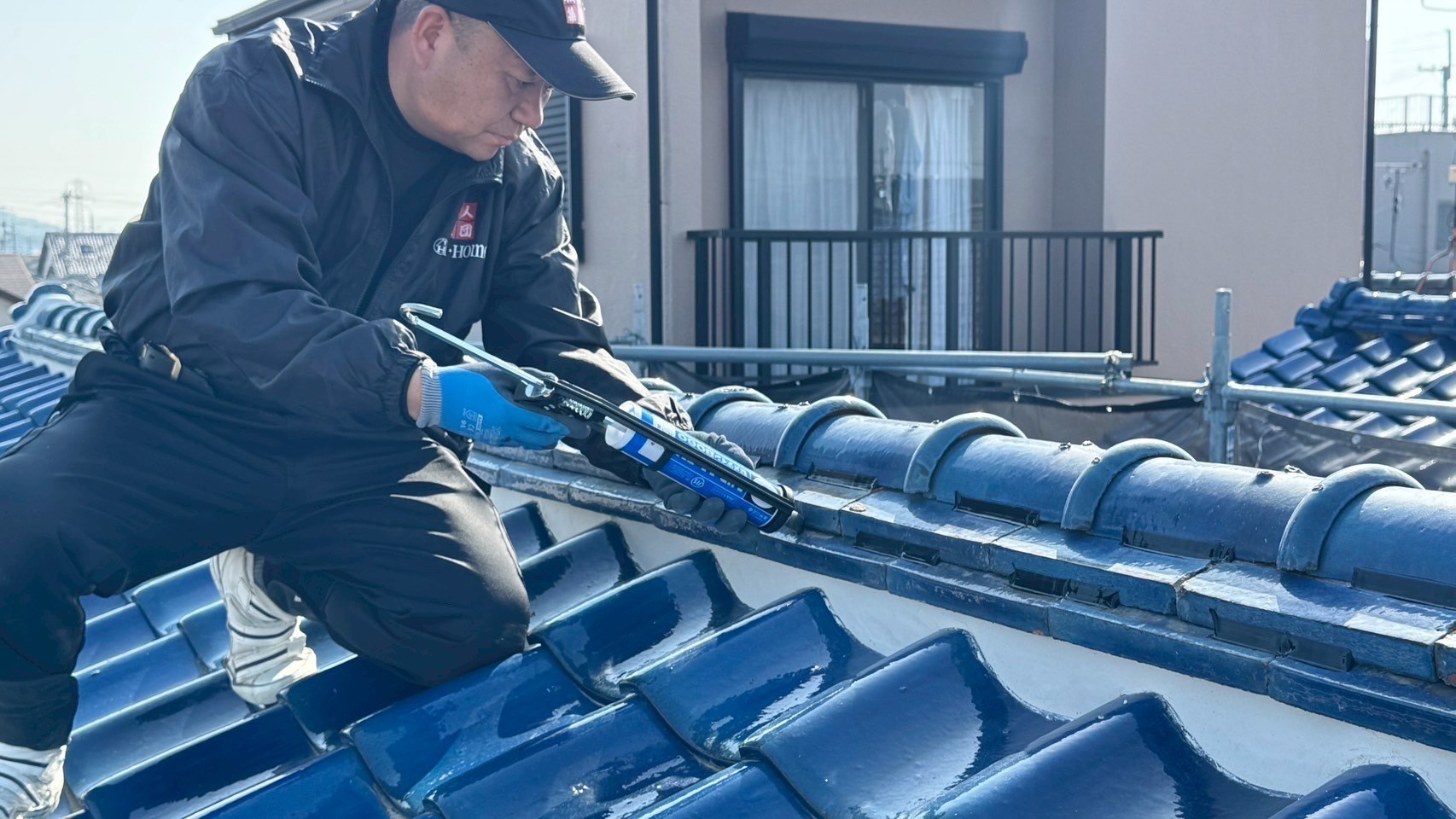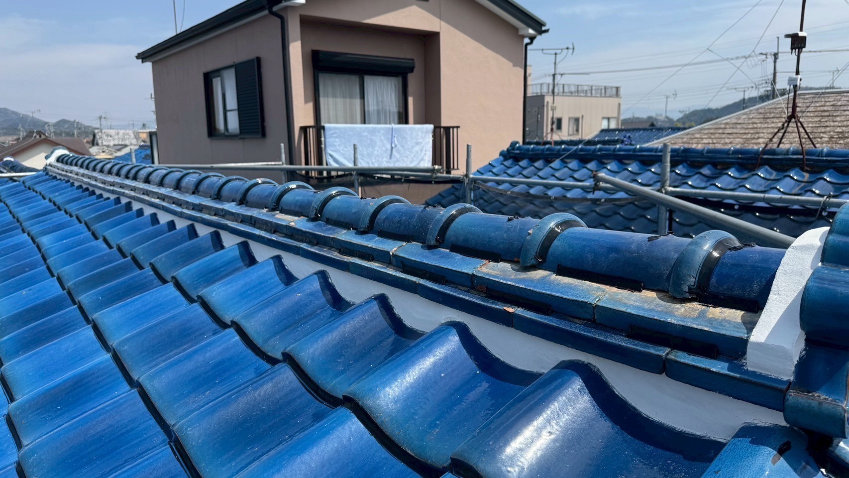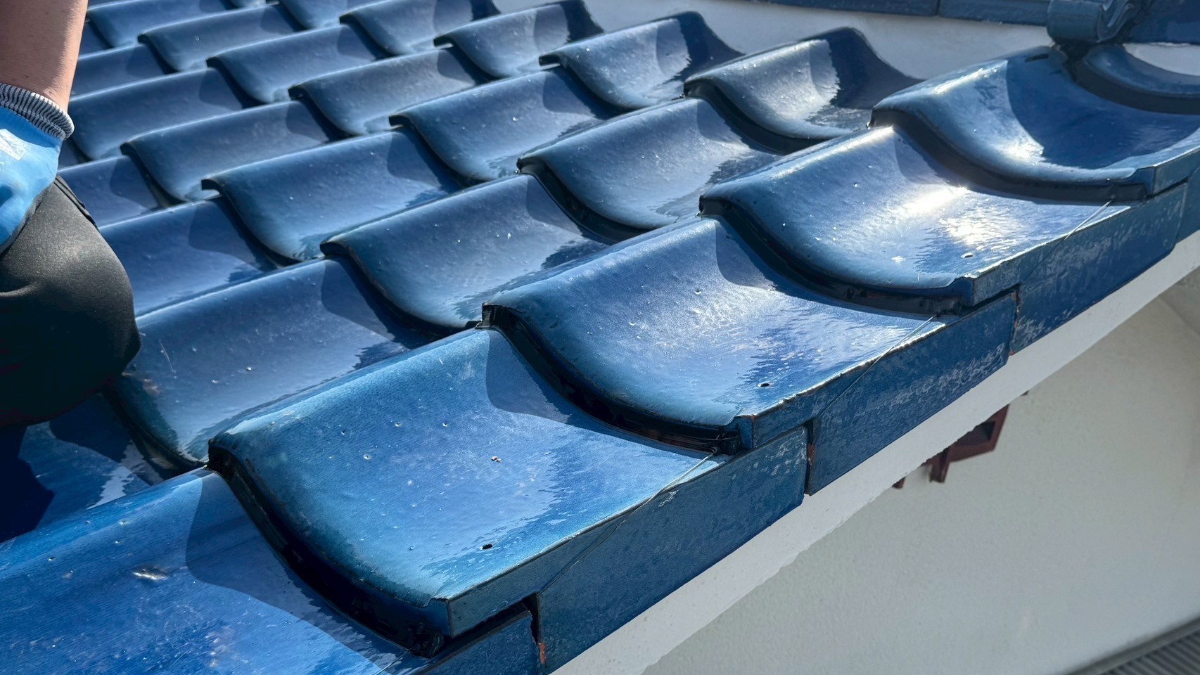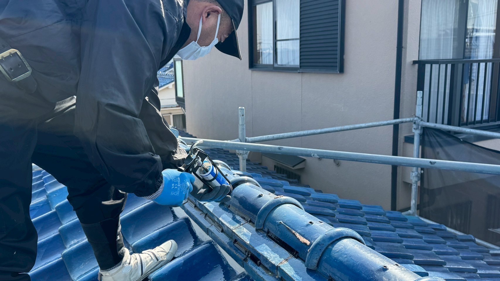 本日の作業は、大屋根の瓦の勾配が4寸5部に満たないので豪雨の時は、雨が差し込んで2階の天井2部屋から雨漏れがするとの事でした。私的には葺き替えも提案しましたが足場の組み立てもできない箇所もありましたのでお客さんの予算のご都合もおありでしたので、何とか葺き替えせずに雨漏れを止めてほしいと相談されたんで、本棟は積み替えたので問題ありません。残りの地瓦、役物瓦は瓦用のシール剤で全面に縦、横を隙間なく絶縁シール打設していきます。これで豪雨が来ても遮断できますので大丈夫ですよ。まだ工事途中ですが引き続き宜しくお願いしますね(^^)