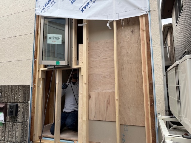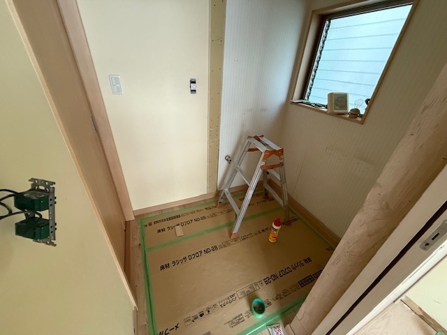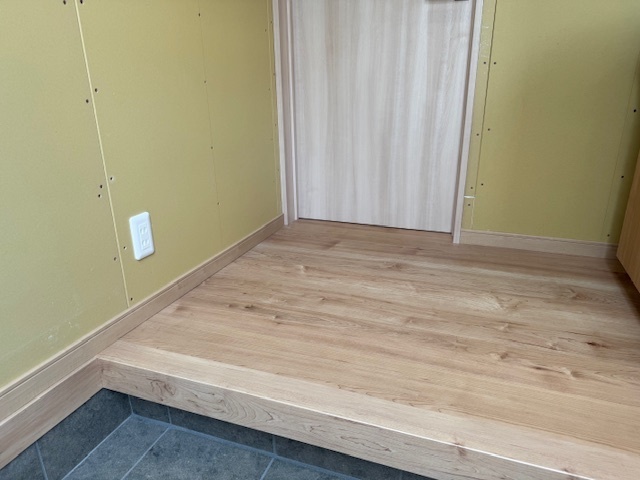 本日の作業は新玄関の巾木を取付ました。新玄関はこれでクロス以外の工事が完了しました。旧玄関も今日で内部の造作は終わり明日はサイディング工事です。旧トイレもフローリングを貼ってクロスの工事を残すばかりです。明日はリビングの建具設置用の垂れ壁の工事とサイディング工事、クロス工事を進める予定です。月曜日にはトイレ設置など行うのでそれまでに急ピッチで内部の工事進めていきます。引き続きよろしくお願いいたします。またアップします。