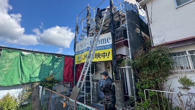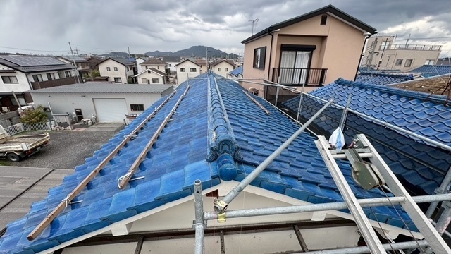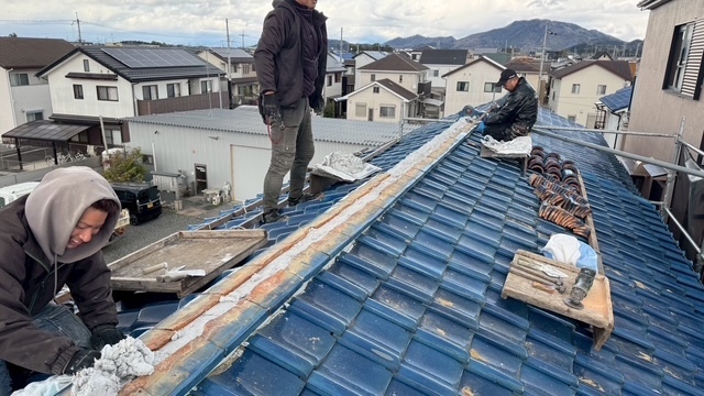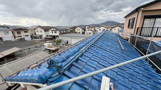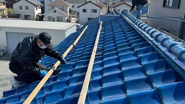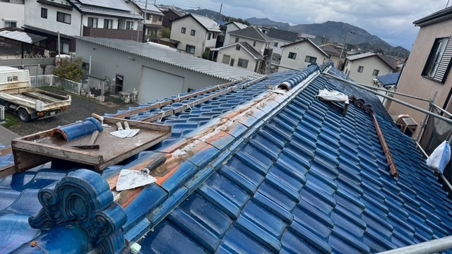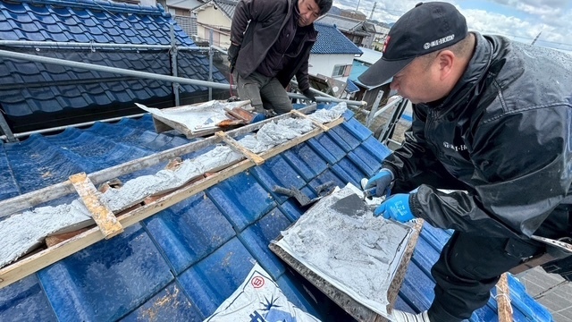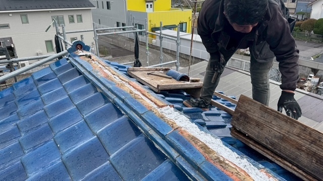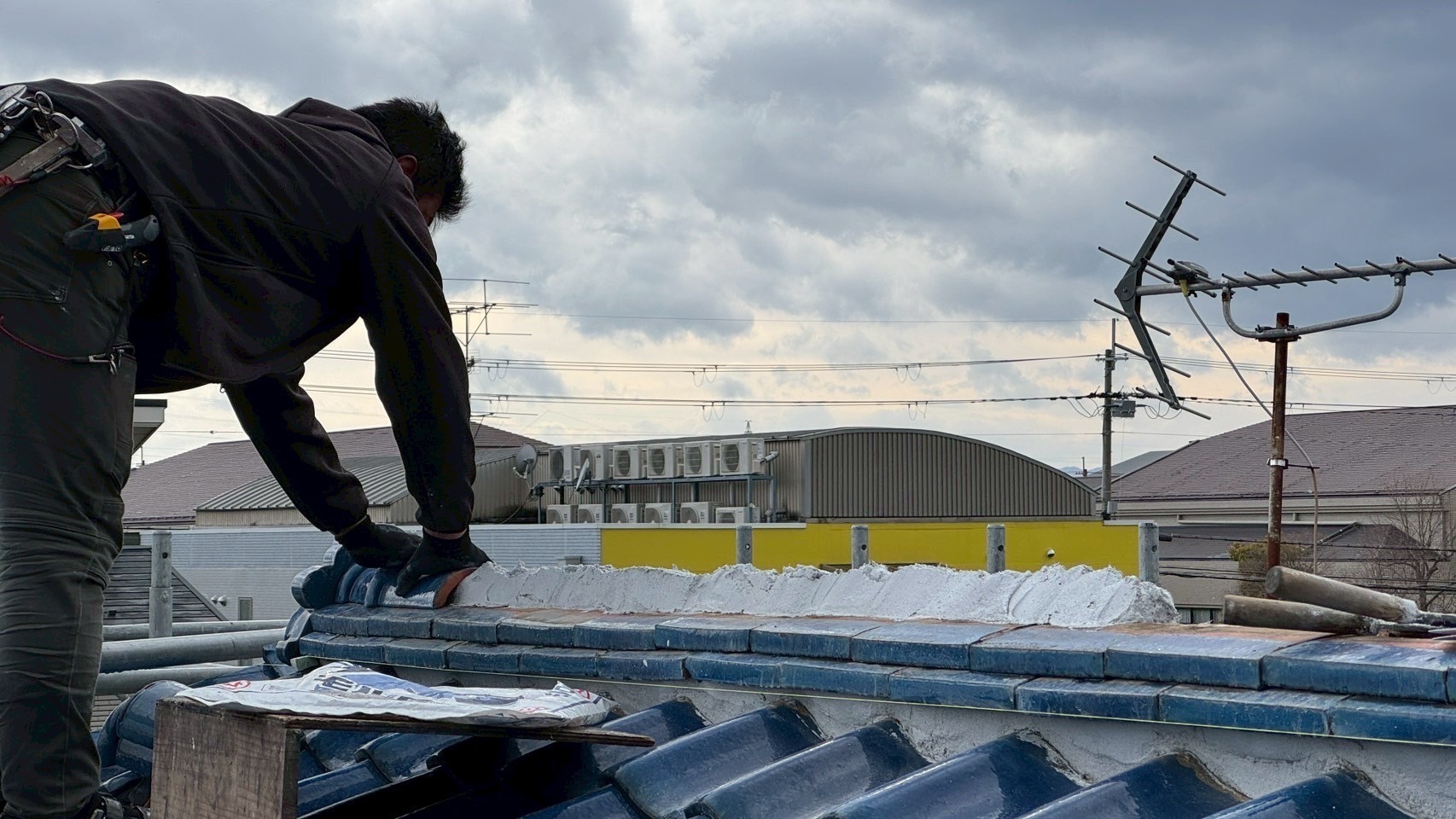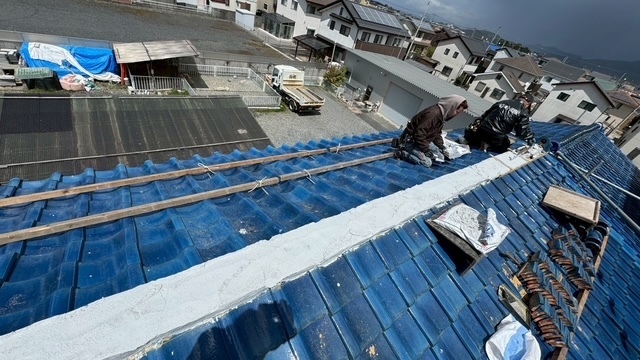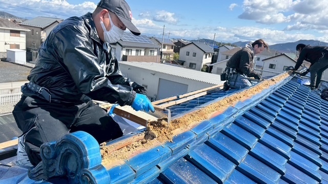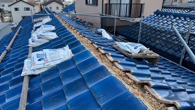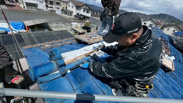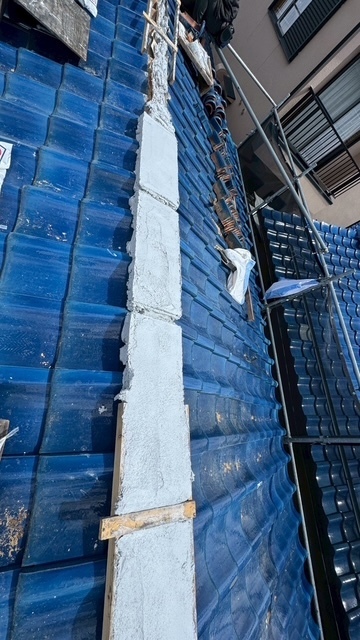 本日の作業は、荷揚げ機を設置して大屋根の既存の本棟の瓦は残して土台とかで使っていた壁土やガラを撤去処分して防水シートレボ1を土台部に敷きモルロック(前名シルガード)で土台を作りノシ瓦は積み終わりました。波板も張り替えなんで撤去処分しました。紐丸冠は仮で乗せてるだけなんで明日も引き続き積んでいきますね。宜しくお願いします(^^)
