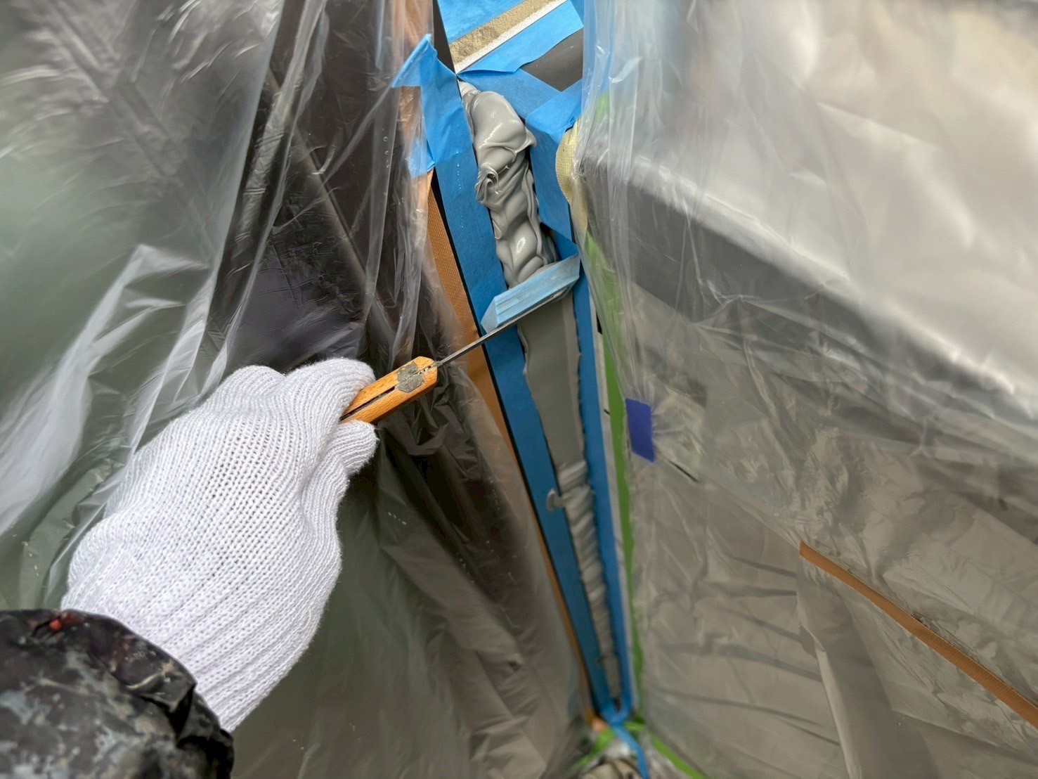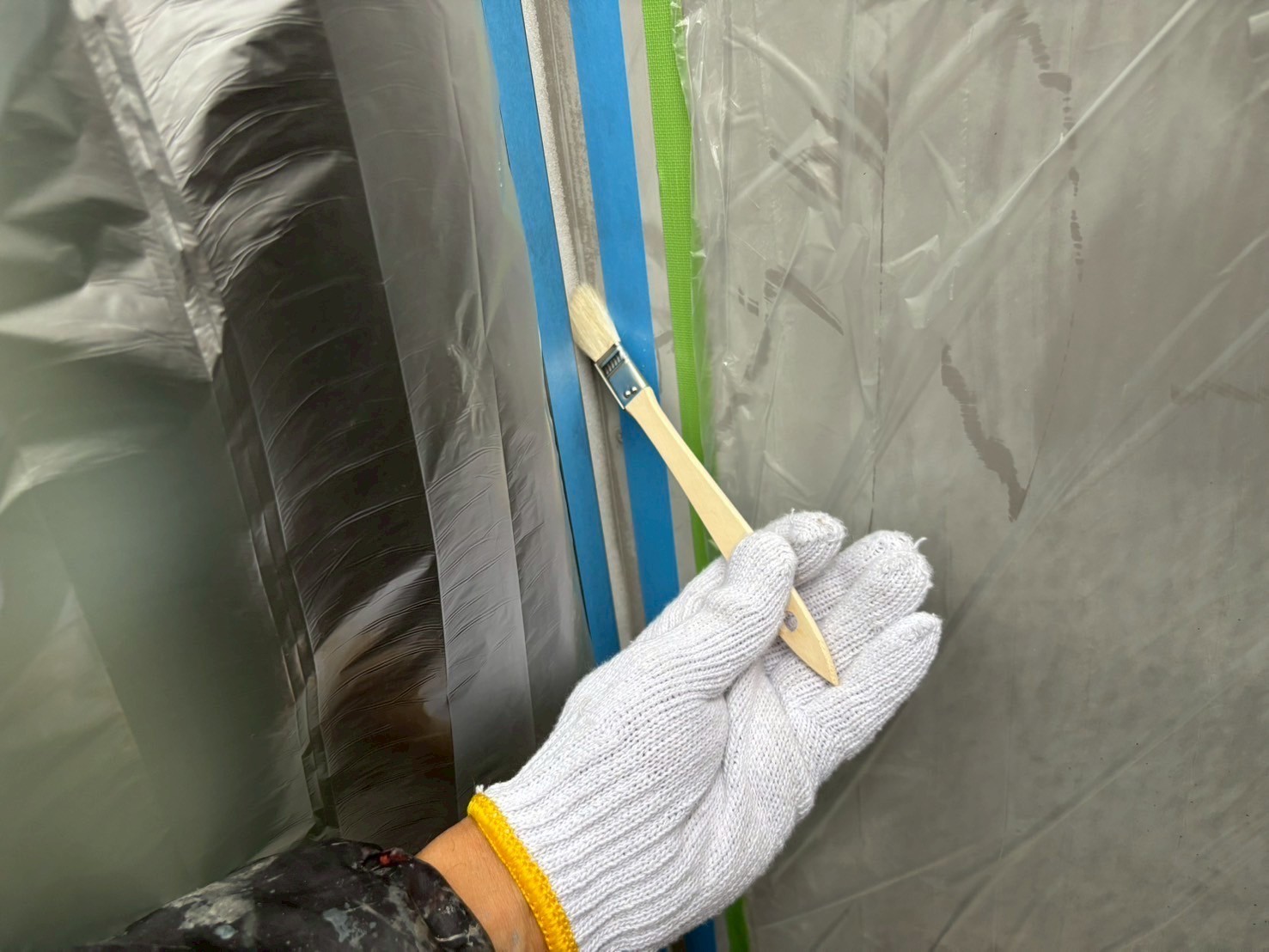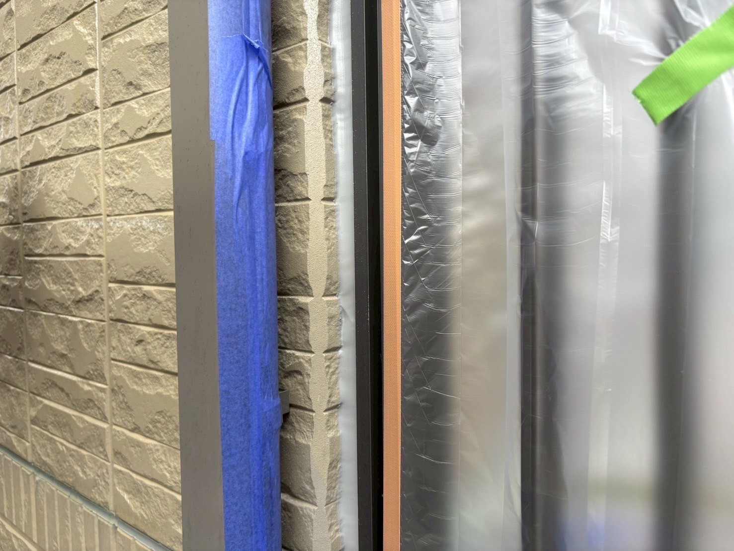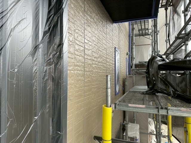 本日の作業は、ハウスメーカーさんが後から付けたベランダらしいのですが外壁とベランダ部の取り合いに隙間があり塗装するのに狭く困難な箇所なんでシールで綺麗に塞ぎました。塞いでも何の問題もない箇所なんで綺麗な仕上がり重視で行きます。引き続き宜しくお願いしますね(^^)