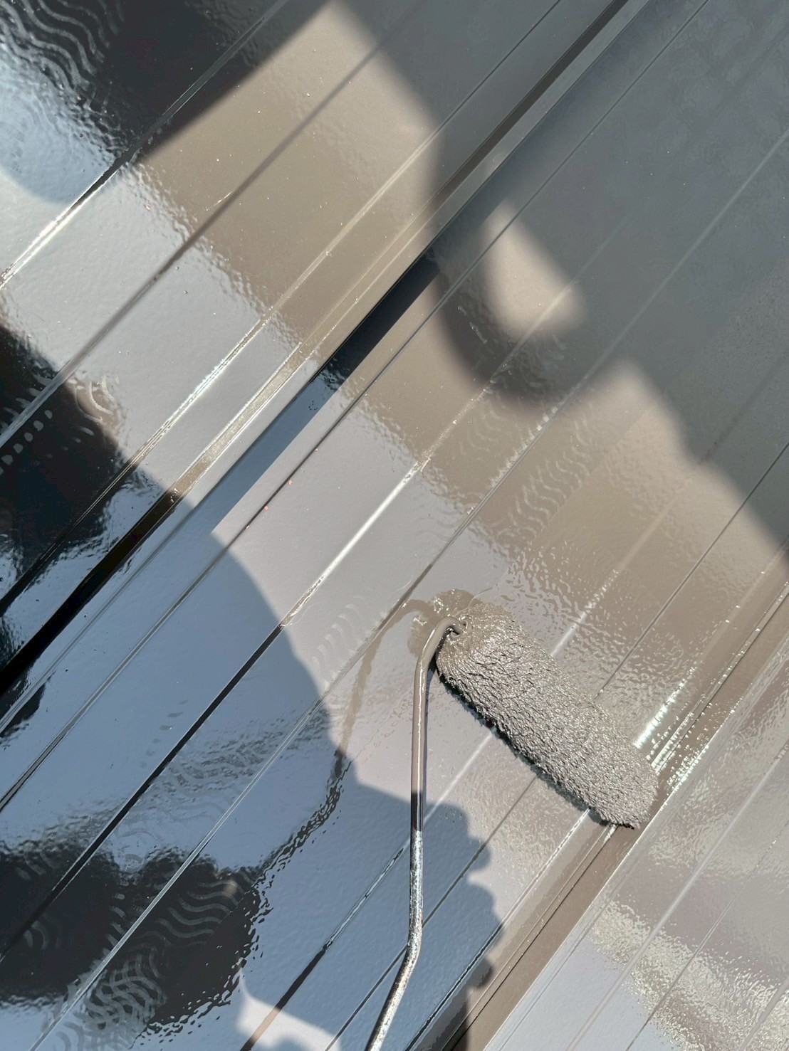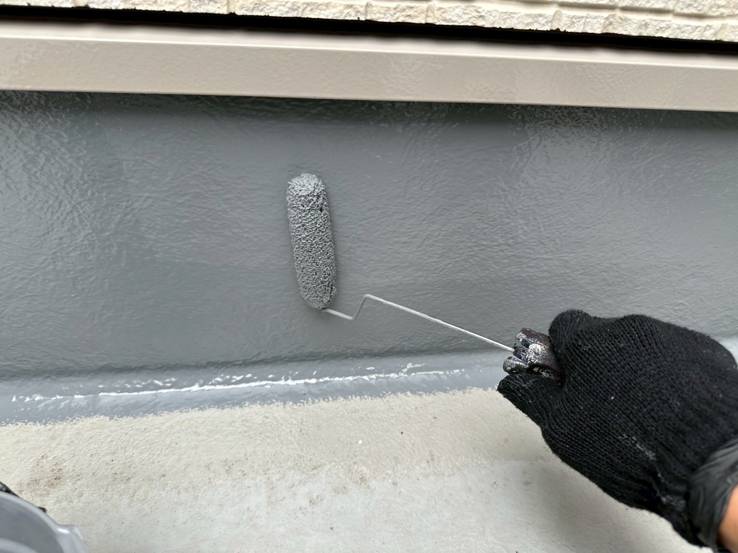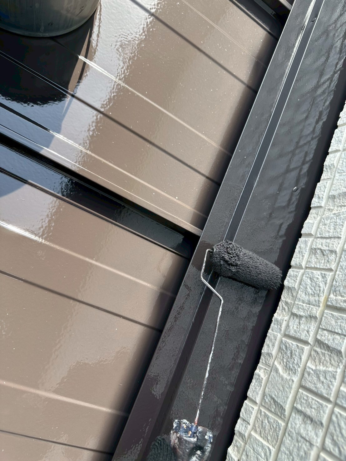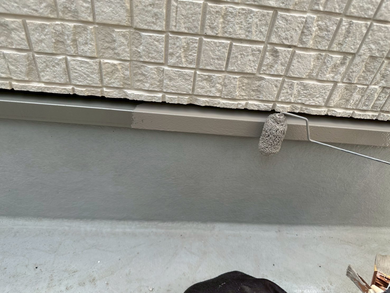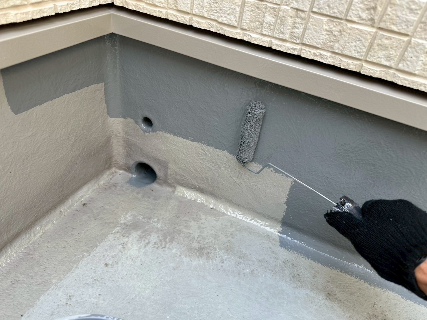 本日の作業は、下屋根を(1液ファインDFルーフのチョコレートN)で仕上げ塗りをして付帯部をファインパーフェクトトップSIの(N-85白系、22-60Bグレー系)を付帯部の使用箇所に使い分けて塗り、ベランダ床は、2回に分けて塗りますので先に床の立ち上がり箇所と室外機設置の下部をオートンウレアックスHG剤を使い作業しました。明日も引き続き宜しくお願いしますね(^^)