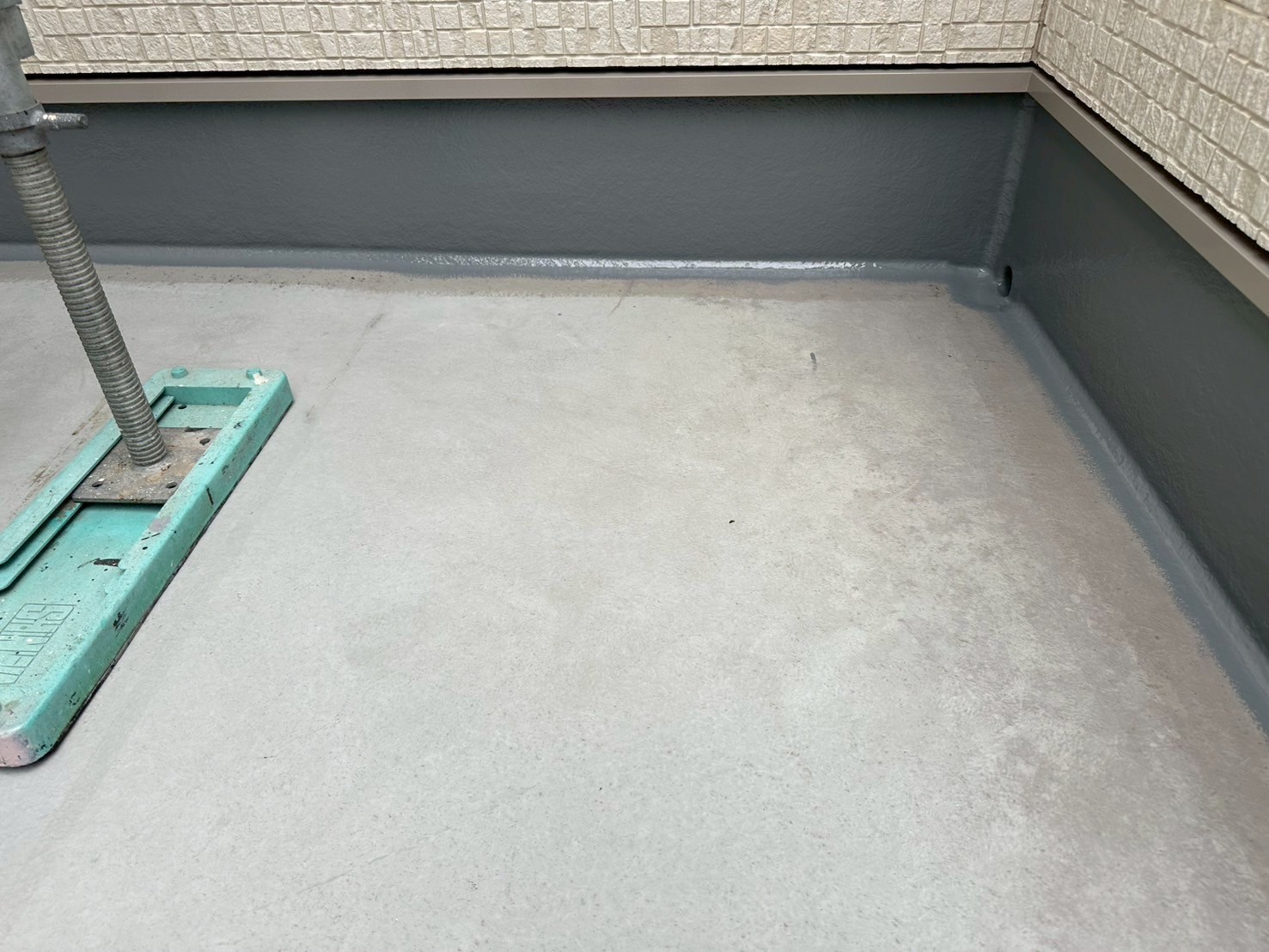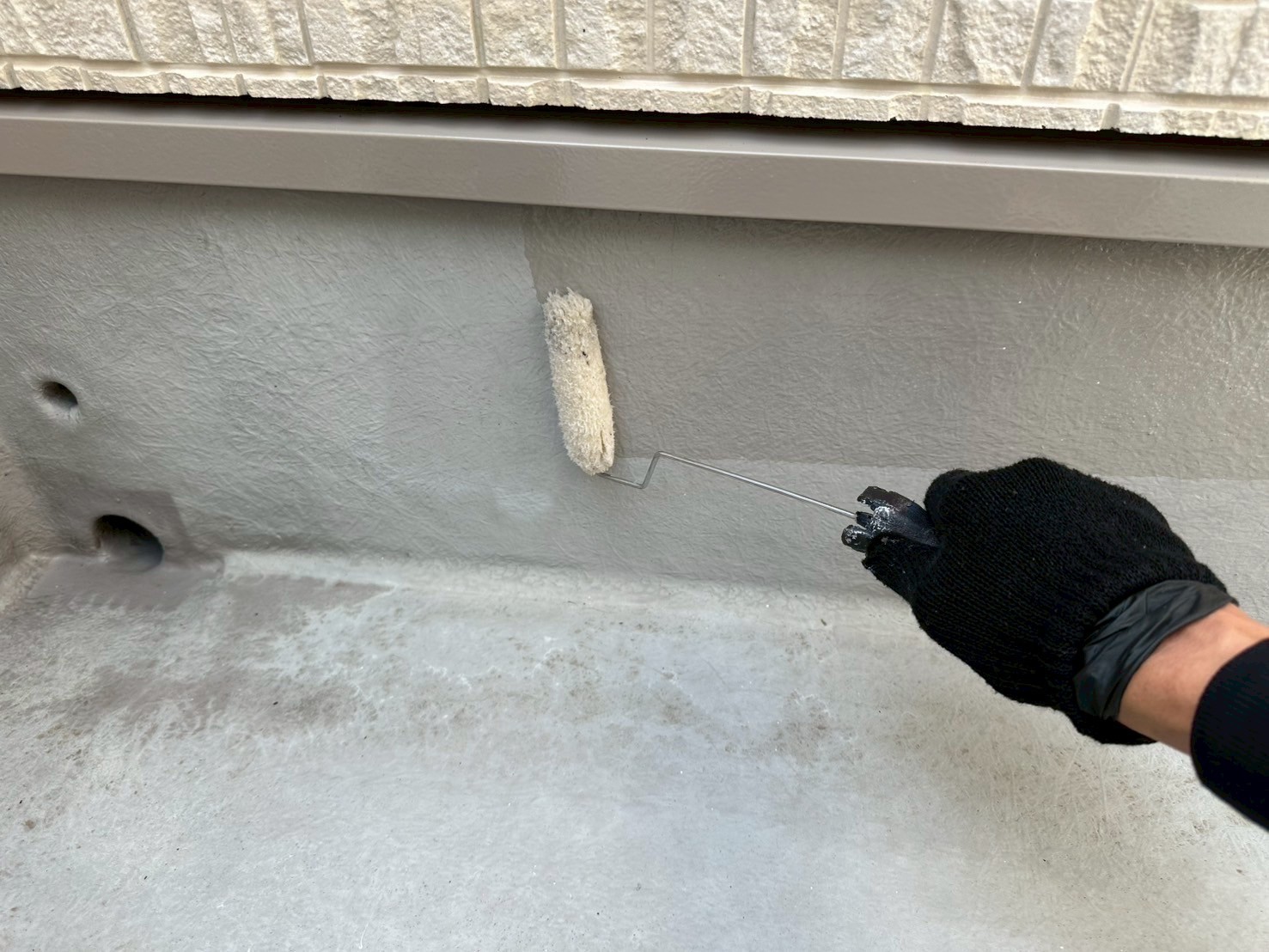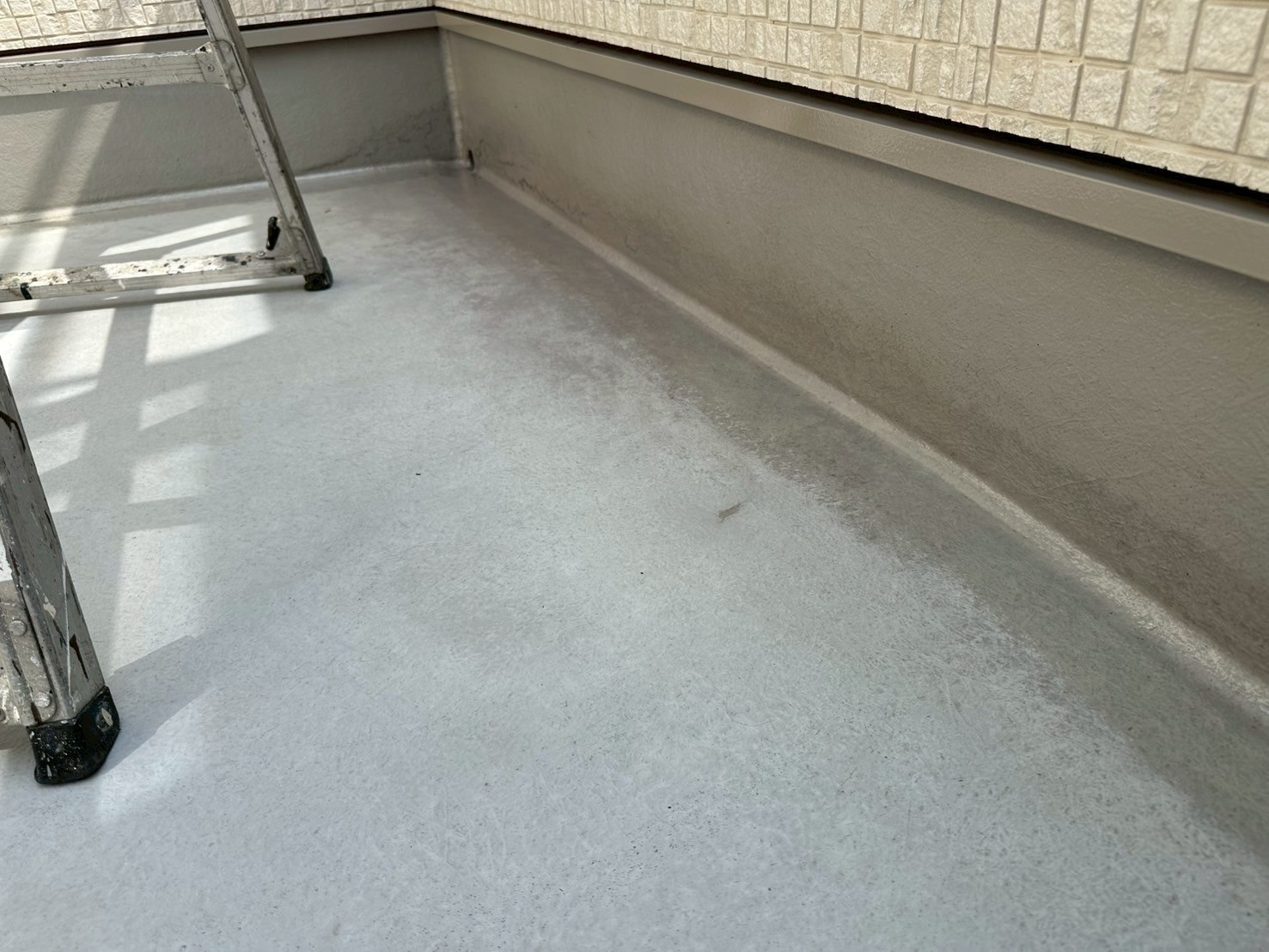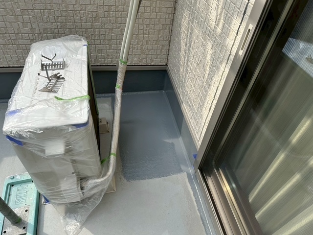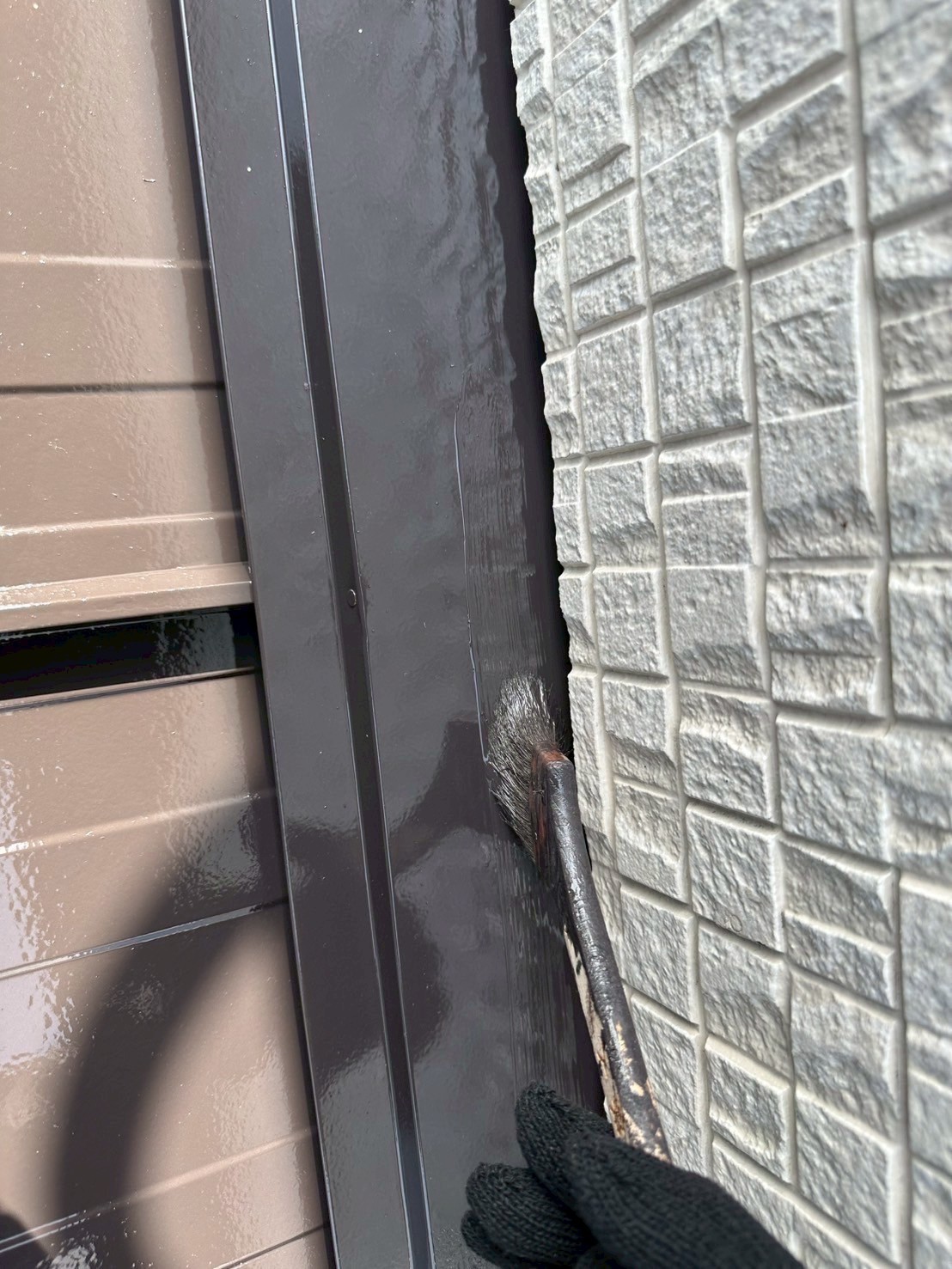 本日の作業は、下屋根を(1液ファインDFルーフのチョコレートN)で仕上げ塗りをして付帯部をファインパーフェクトトップSIの(N-85白系、22-60Bグレー系)を付帯部の使用箇所に使い分けて塗り、ベランダ床は、2回に分けて塗りますので先に床の立ち上がり箇所と室外機設置の下部をオートンウレアックスHG剤を使い作業しました。明日も引き続き宜しくお願いしますね(^^)