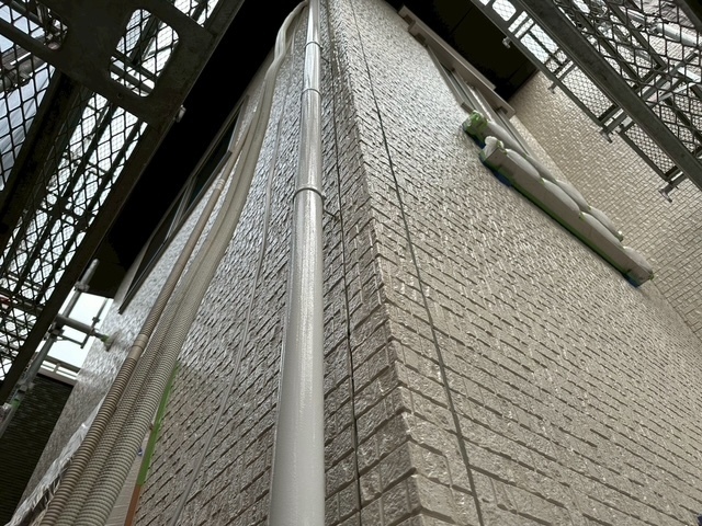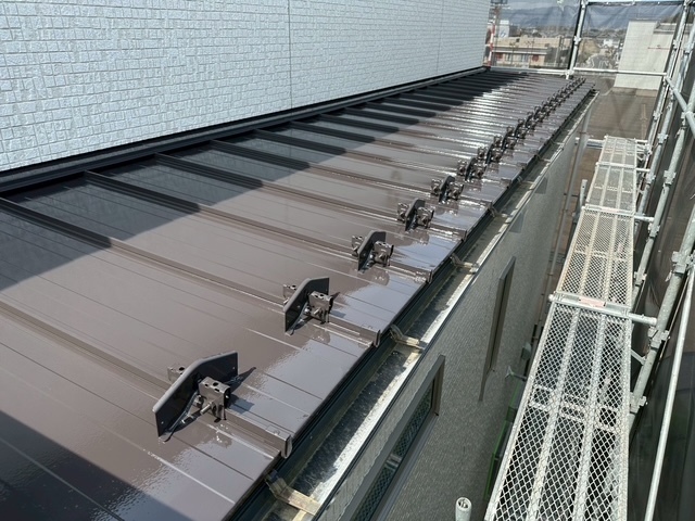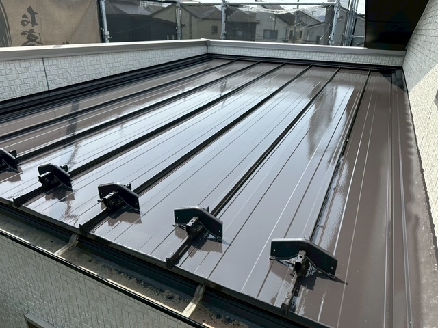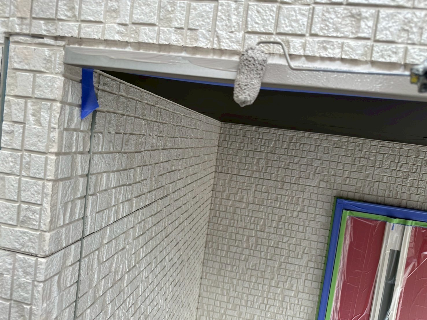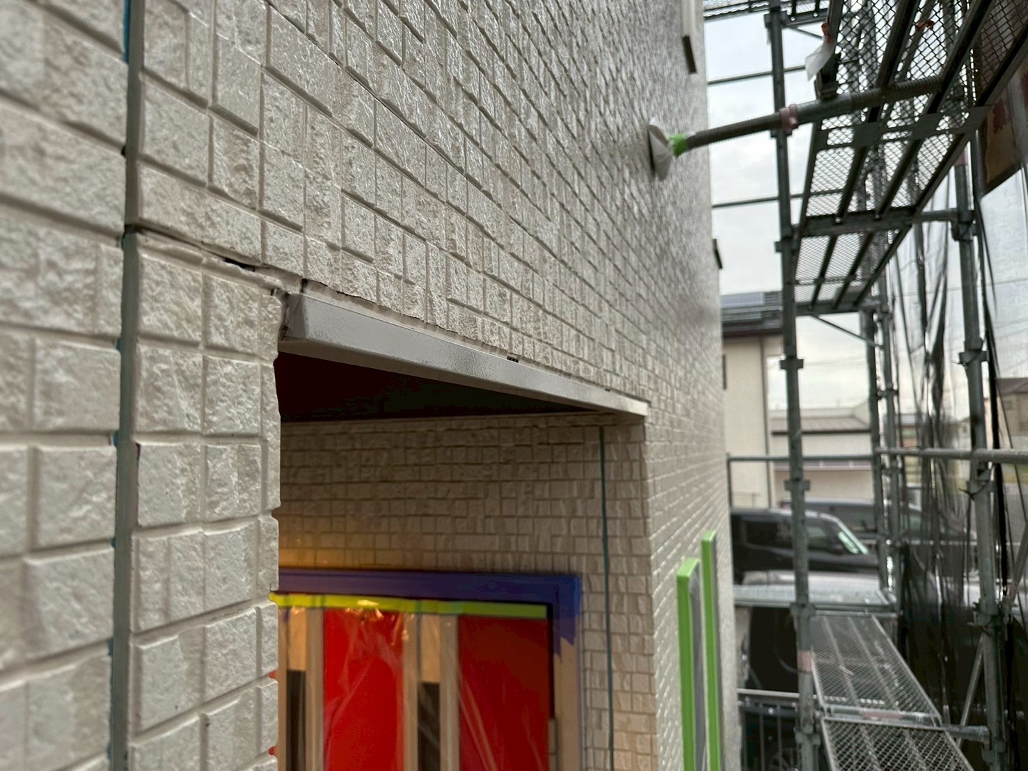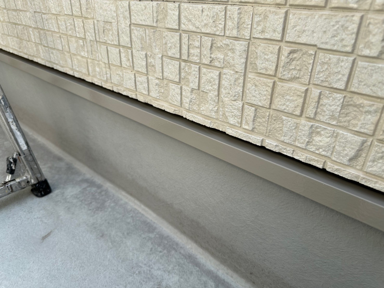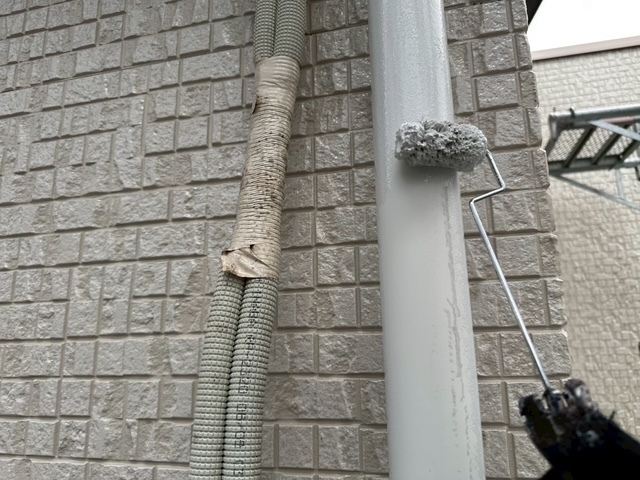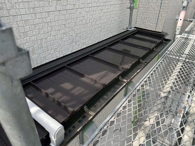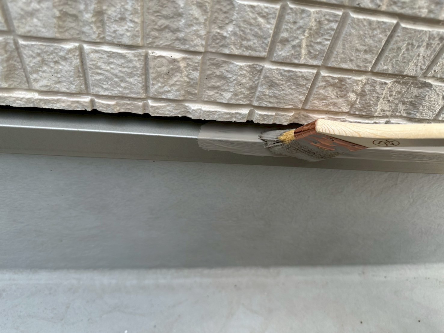 本日の作業は、下屋根を(1液ファインDFルーフのチョコレートN)で仕上げ塗りをして付帯部をファインパーフェクトトップSIの(N-85白系、22-60Bグレー系)を付帯部の使用箇所に使い分けて塗り、ベランダ床は、2回に分けて塗りますので先に床の立ち上がり箇所と室外機設置の下部をオートンウレアックスHG剤を使い作業しました。明日も引き続き宜しくお願いしますね(^^)