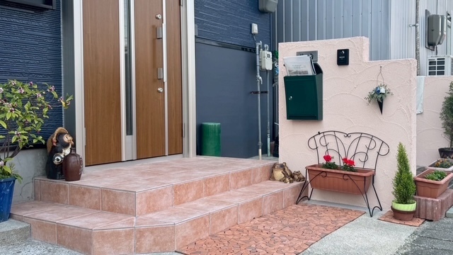 朝、固定テープ、養生等を剥がしに行き完成です。玄関タイルと塀が優しい感じの色味なんで引き立ってますね。色々工事を頂きありがとうございました。お家の事ならアイホームに何でもお任せ下さいね(^^)