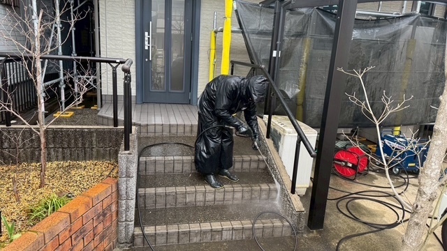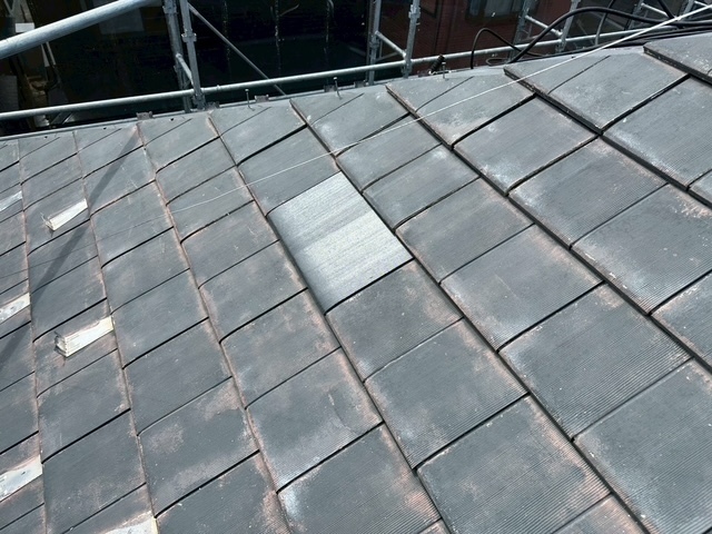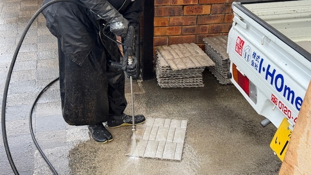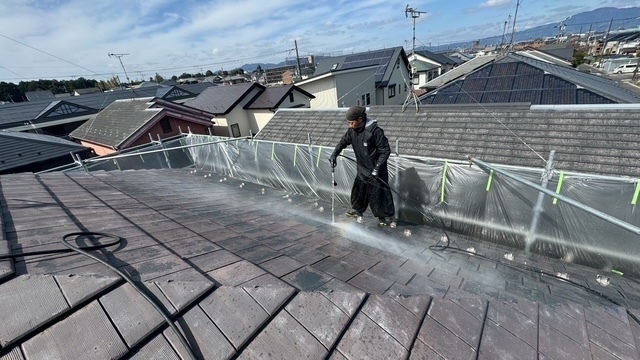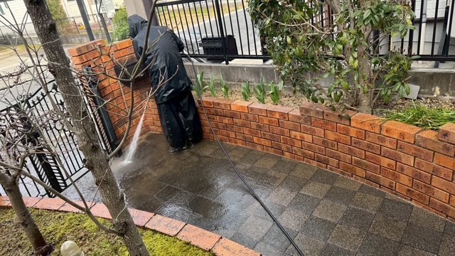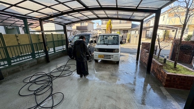 本日の作業は、屋根外壁と駐車場の土間と玄関通路、ベランダの床材も洗浄しました。その後は、屋根のスレート瓦が現地調査時に破損していましたので差し替え工事もしておきましたよ。引き続き宜しくお願いしますね(^^)