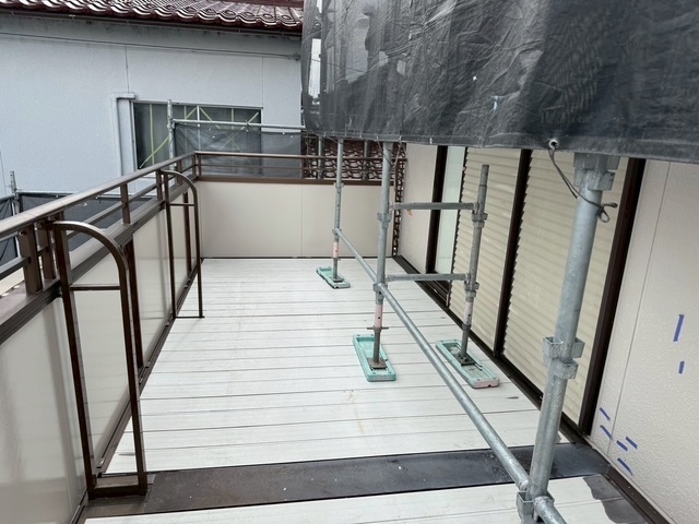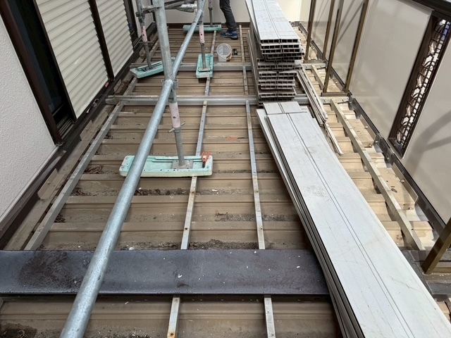本日の作業は、老朽化で曲がってる既存のベランダの床板を撤去処分しました。続いて床下屋根の塗装が終わってから後日、新しい床板を取り付けますね。引き続きよろしくお願い致します。