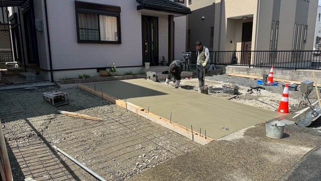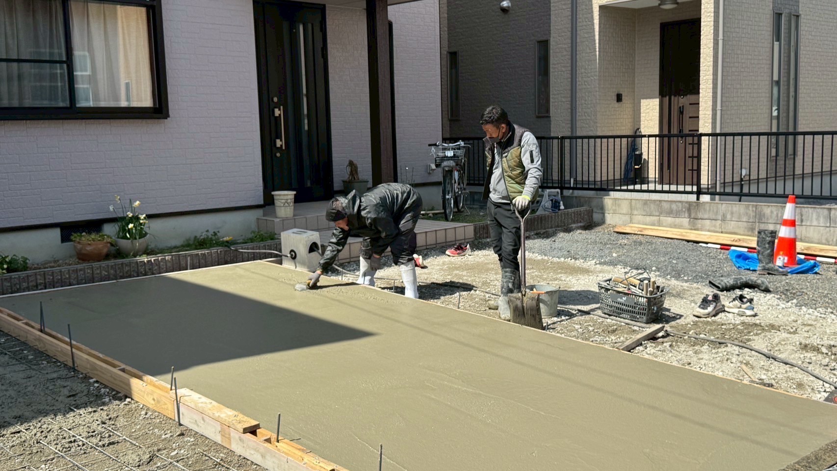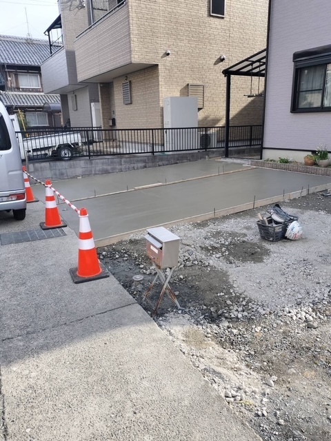 本日の作業は、先日に型枠レベル出し金網メッシュを敷きコンクリートを打設してコテ押さえ(仕上げ)しました。引き続き宜しくお願い致します。
