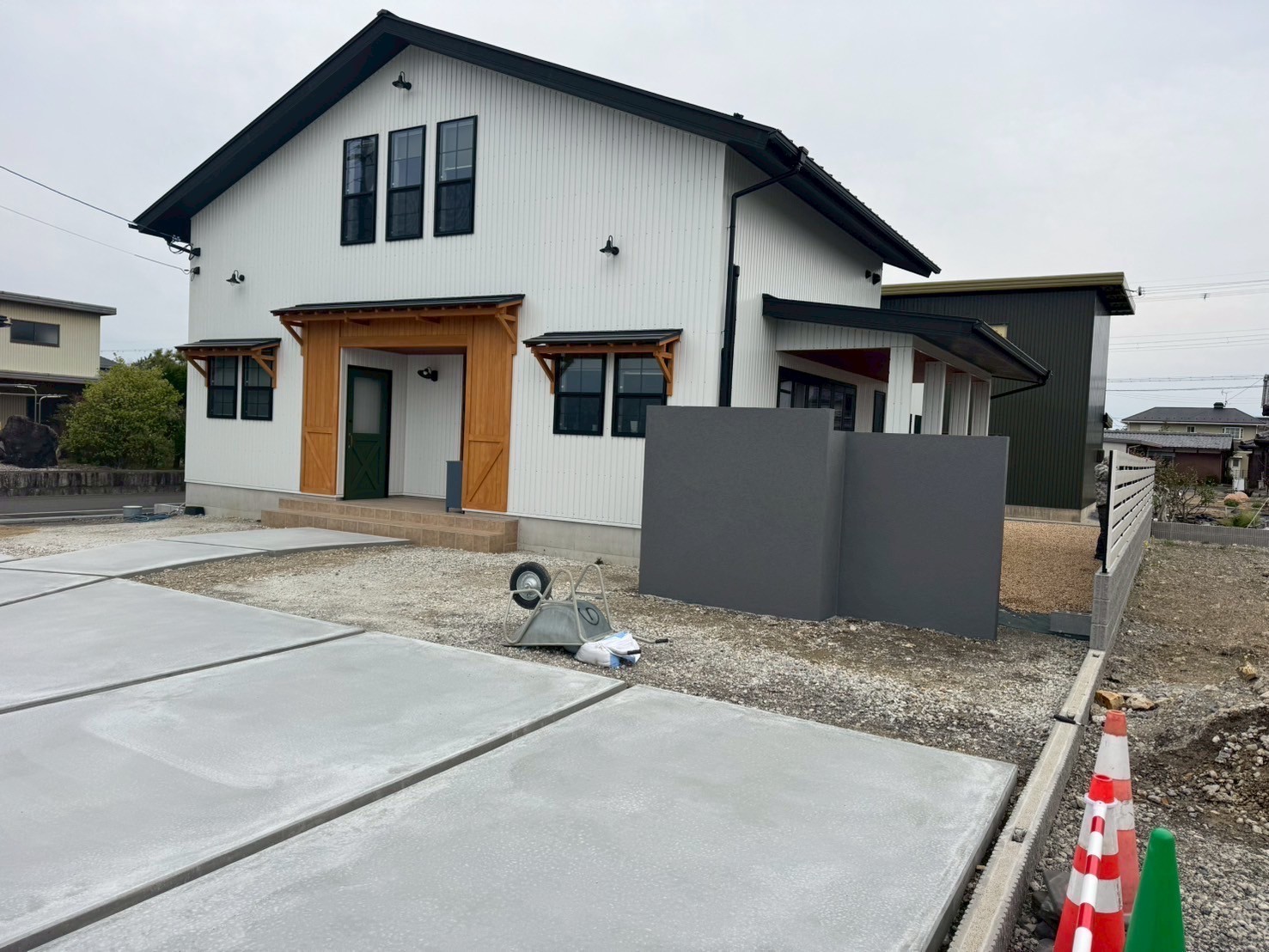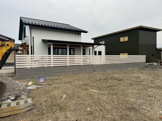 本日の作業は、先日土間コンクリート工事して1週間位経ったので型枠を取りました。後ほど土間のラインの隙間に何か工夫しますが仕上がりが楽しみですね(^^)後、立派なフェンスを取り付けました。木目調のホワイトです。値段が張るので中々当社でも注文されない商品ですがI様、思い切りましたね!(^^)!支柱は、高級感が出るので私が黒を薦めました。引き続き宜しくお願い致します。