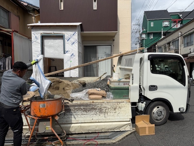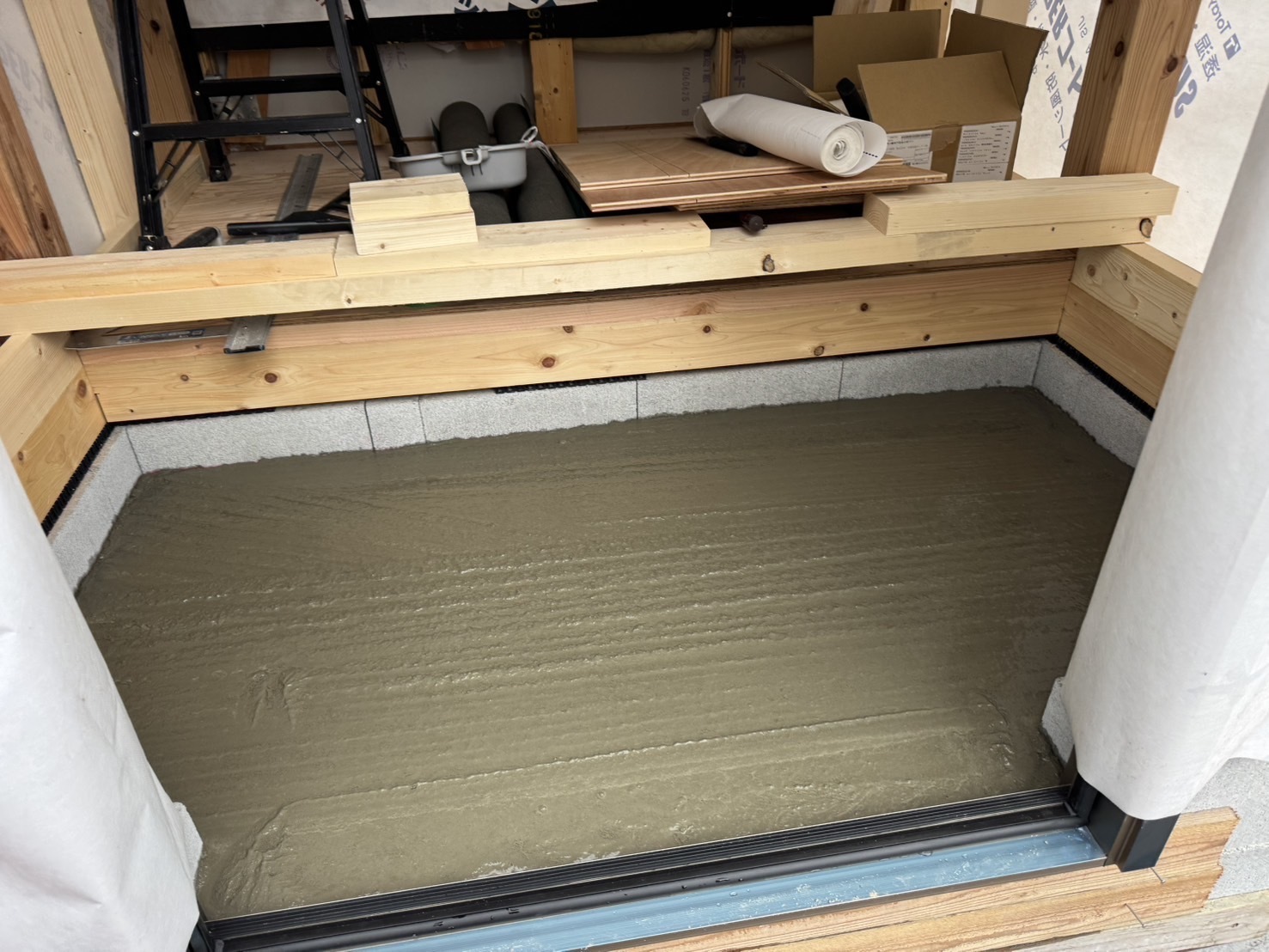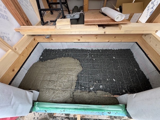 本日の作業は玄関の土間の施工です。荒打ちですので大工さんが作業終わったら下地をしっかり処理してタイルを施工する予定です。土日は乾燥させて月曜日から屋根工事を進めてそのあとは玄関ドア設置やサッシの取付とサイディング施工進めていきます。引き続きよろしくお願いいたします。またアップします。