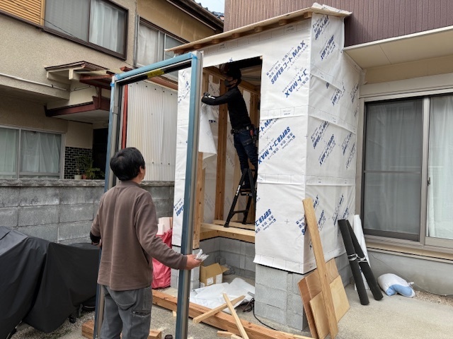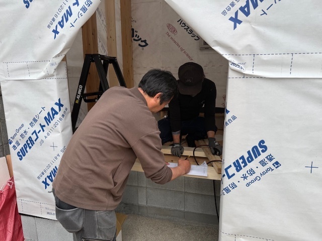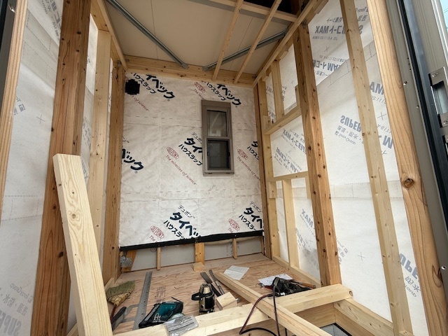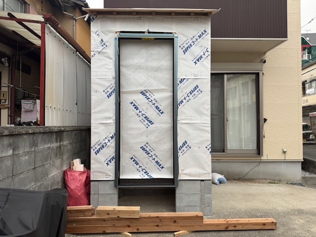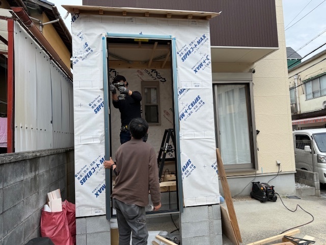 本日の工事は壁の下地や開口部の窓枠などの施工を行い夕方に玄関ドア枠が届きましたので組み立てて設置しました。明日は玄関部の土間打設を行います。引き続きよろしくお願いいたします。またアップします。
