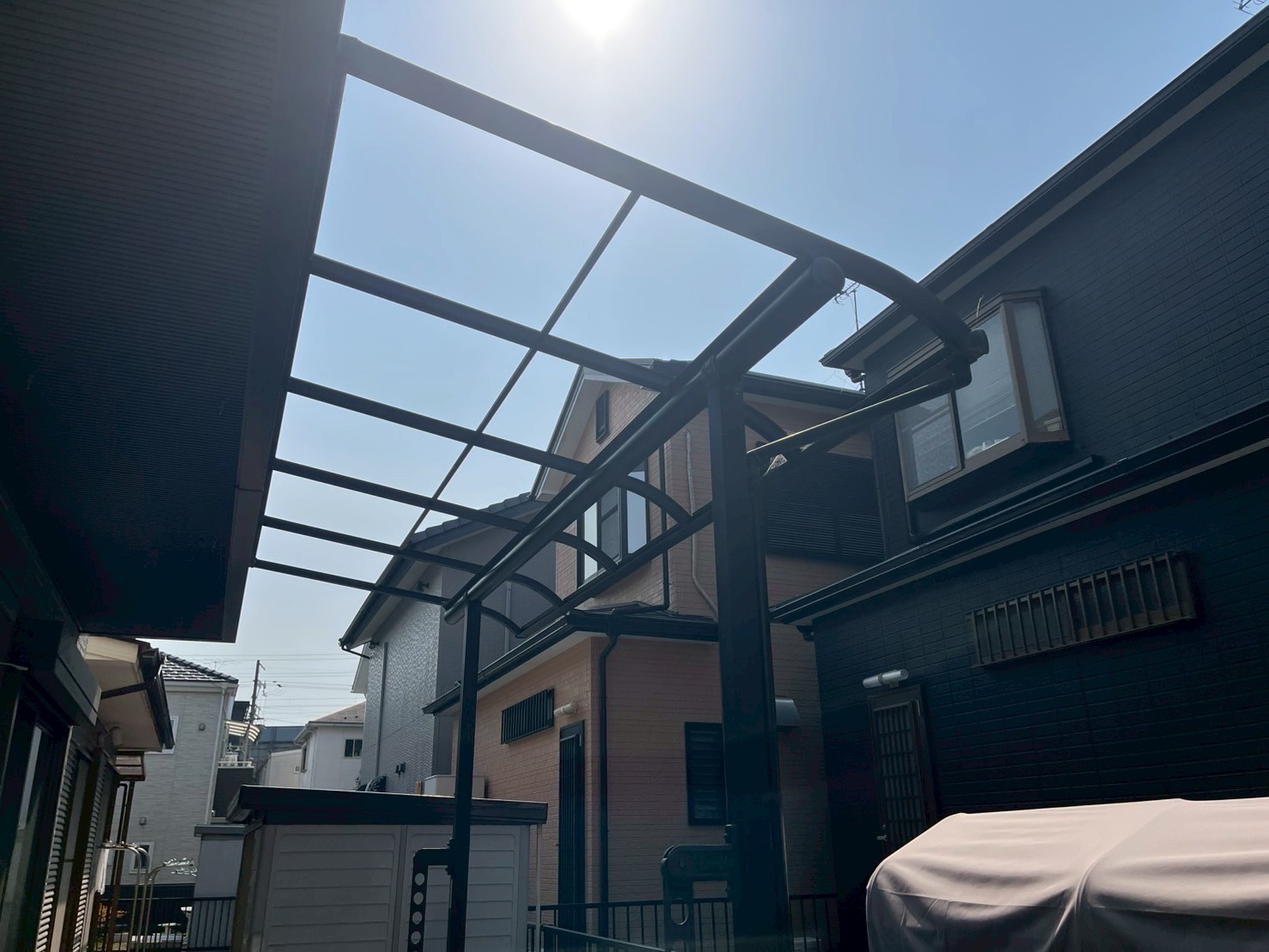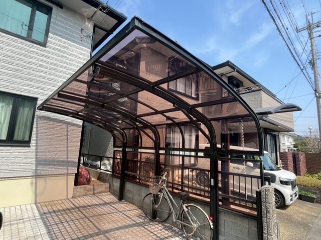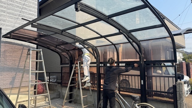 本日の作業は、既存のカーポートのパネルがアクリル板で老朽化が進みヒビが入ってました。新しくポリカカーボネート板で取り付けました。工事は全て完了になります。外壁も綺麗になりましたね。ありがとうございました。お家の事ならアイホームに何でもお任せ下さいね(^^)