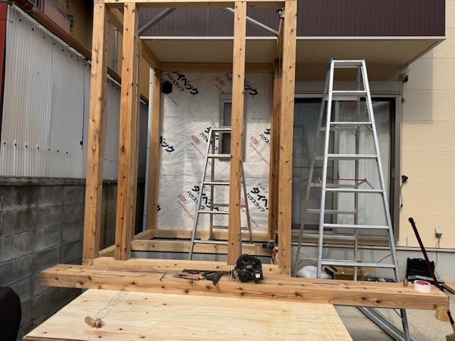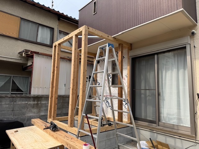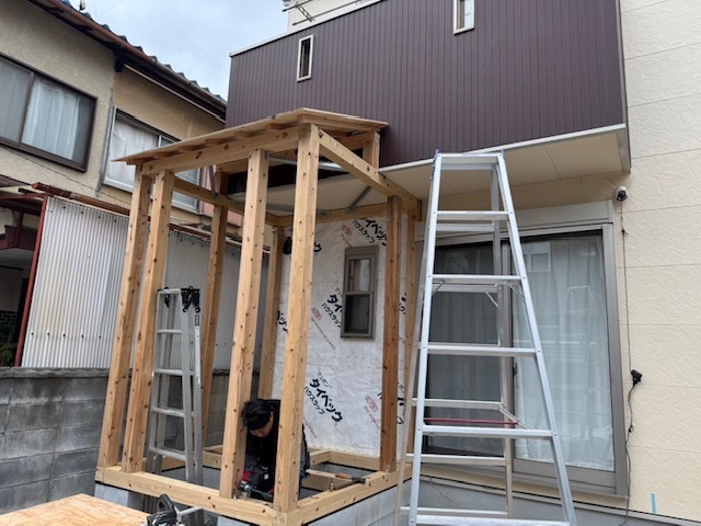 本日の作業は先日組み終わった土台に柱を立てて屋根まで工事完了できました。ベランダ下にも干渉するため現場で採寸しながら木材を刻み組み立てする作業となっております。天気も良く予想より順調に進みました。明日も下地工事を引き続き行います。またアップします。