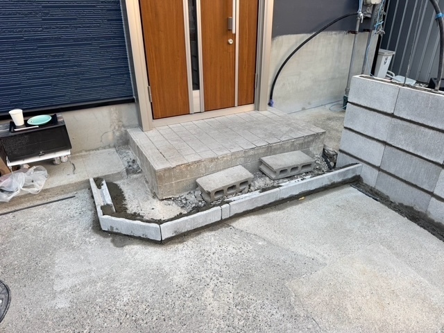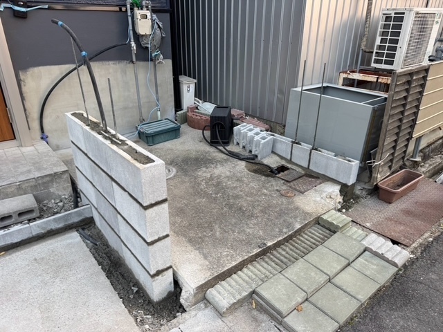 今日から外構工事の着工でブロックを積んでいき電気配線の管をインターホン取り付け部まで土間を削り積んだブロックの中に仕込みました。これからですが左官ブロックを積みモルタル下地をしてジョリパッド仕上げしますので完成が楽しみですね(^^)引き続き宜しくお願い致します。