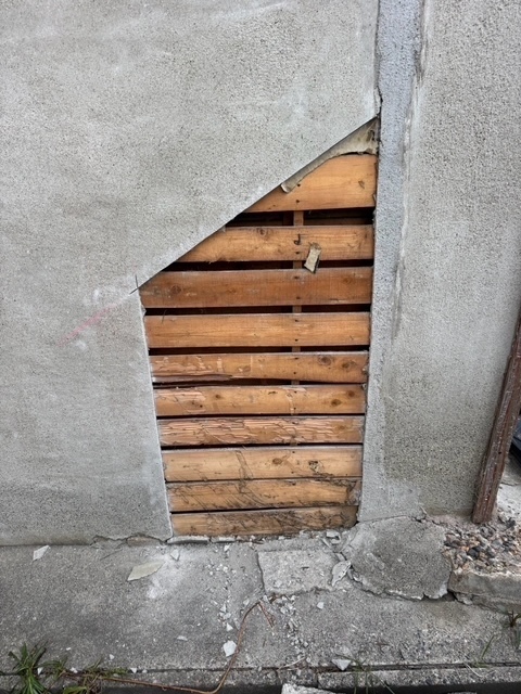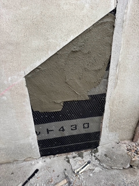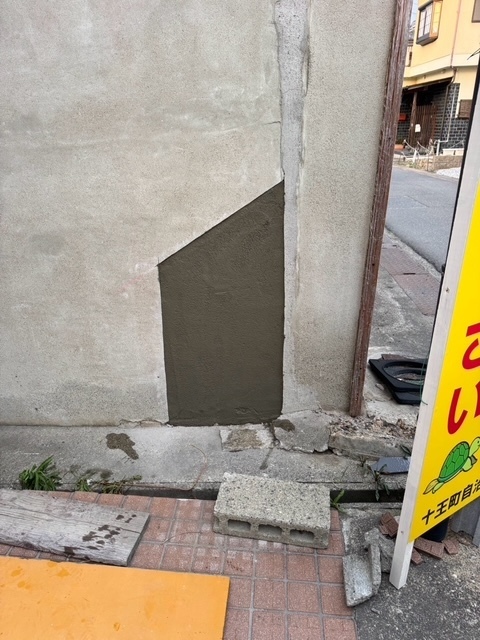 本日の作業は、モルタル外壁の破損部をカットして外壁下張り材(防水シート)を張りモルタルで荒下地を塗りました。明後日壁ズラまで塗り込んでから外壁モルタル部全体を左官ゴテで仕上げ塗りをします。引き続き宜しくお願い致します。