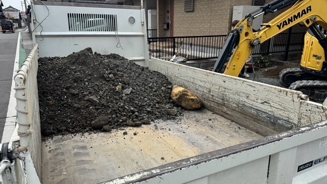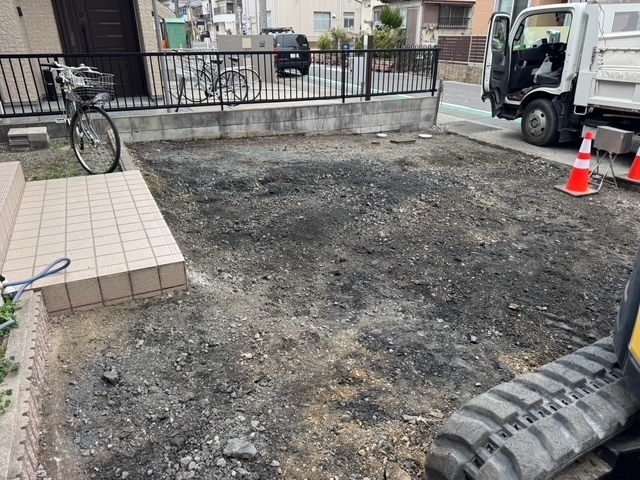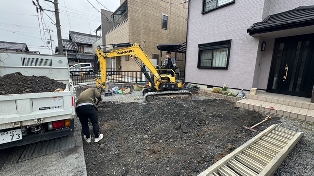本日は外構工事をする前に切削工事をして既存の残土を撤去処分しました。仕上がりを楽しみにしといて下さいね(^^)明日も引き続き宜しくお願い致します。
