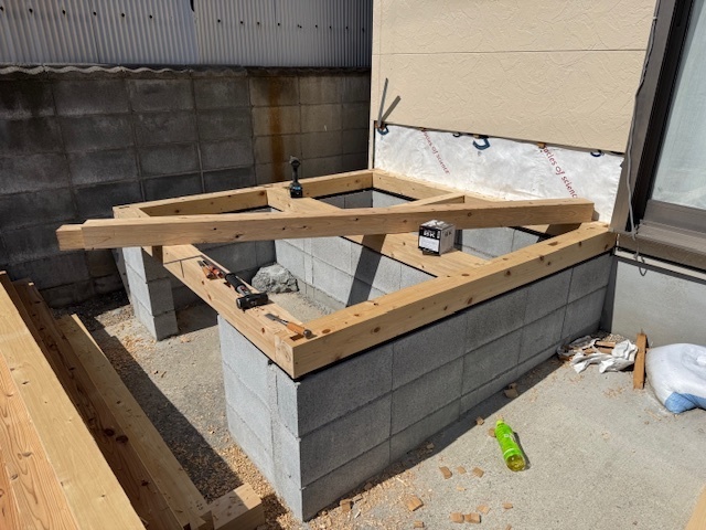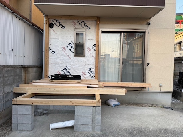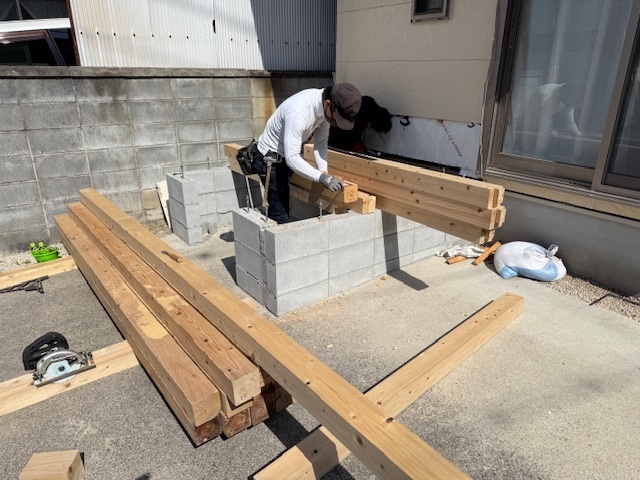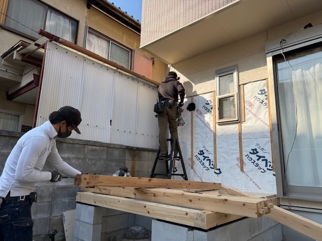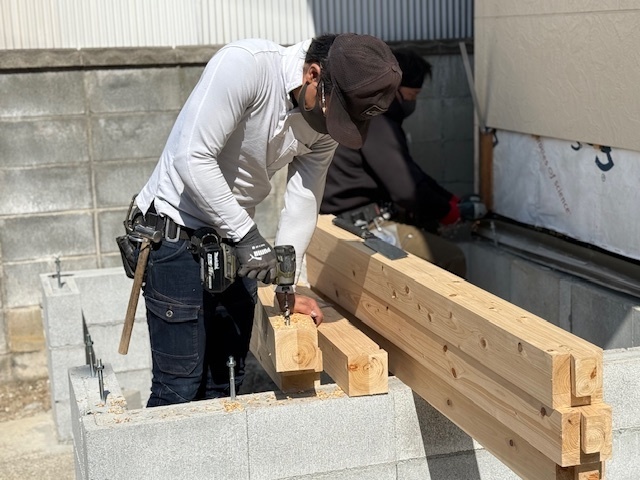 本日は大工作業で土台の据え付けと外壁の捲りを行いました。外壁面の柱を2本建てるところまで進めました。月曜日には他の柱も設置していきます。引き続きよろしくお願いいたします。またアップします。