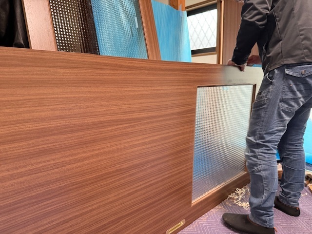 本日の作業は昨日の続きで建具の交換工事をさせていただきました。全てのお部屋チェッカーガラスで統一され本当にかわいく素敵な扉になりました。建具の調整も設置後に行い今まで硬かった箇所もスムーズに開閉できるようになりました。襖の張替えも2ヶ所させていただき建具工事は完了となります。次は外構工事が本格的に始まります。引き続きよろしくお願いいたします。またアップします。