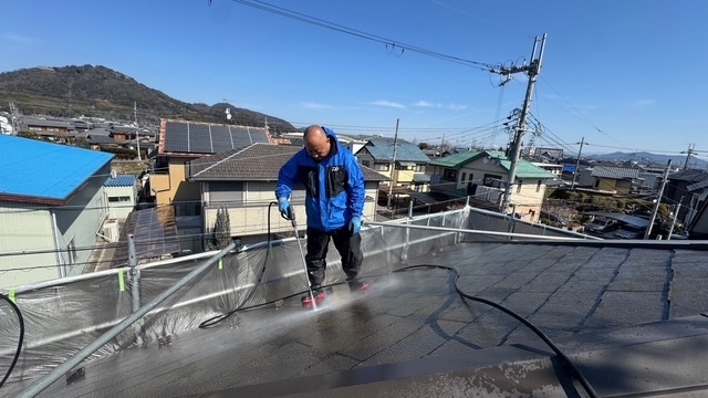今日は、よいお天気なんで洗浄作業も気持ちいいですね(^^)私も打ち合わせが終わりたまには洗浄作業を手伝うのに少しスレート屋根を洗いました。苔の汚れも綺麗に落ちました!引き続き宜しくお願いしますね。