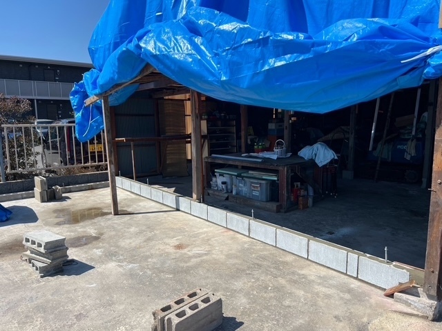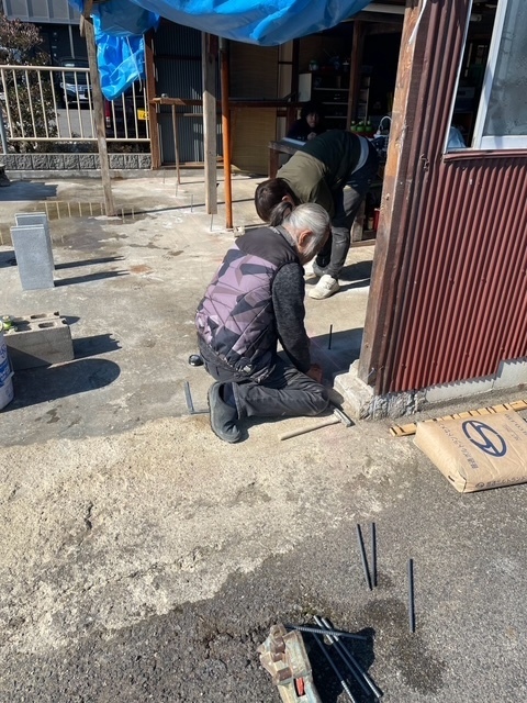 本日の作業は、土間に穴をあけ鉄筋を入れアンカーボルトの場所を決めてブロック基礎を積みました。造作の材料の搬入もできましたので明日から大工工事にかかって行くのと追加工事で倉庫内に木で補強してある控えを全部撤去してしっかり補強してほしいと依頼を受けたので腕の見せ所です!引き続き宜しくお願い致します。