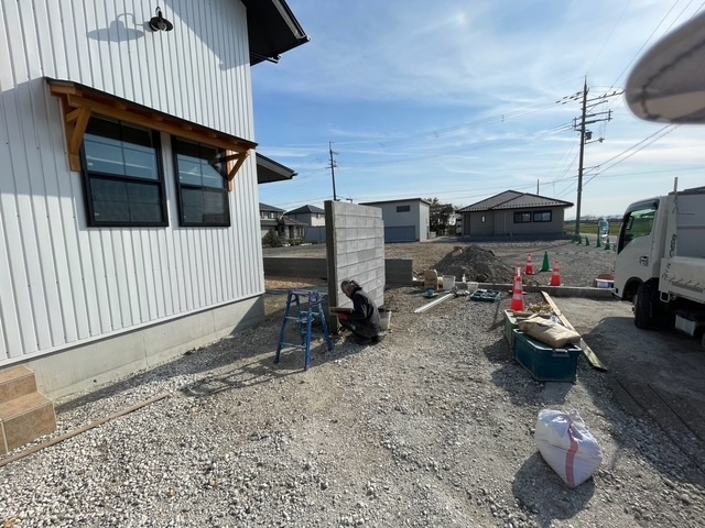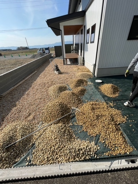 本日の作業は、錆砂利を敷きプレートで均しブロックを積んだ塀にモルタル下地をして乾いたら後日ジョリパッドで化粧塗りをしていきますね。引き続き宜しくお願い致します。
