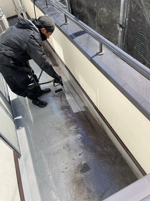 本日の作業は、ベランダに敷いてあるプラスチックタイルを撤去して床下の汚れ、水垢をしっかり掃除しました。また私が個人的に仕上がりのイメージを思い、玄関ドア、ベランダ手摺り、ポストがアルミですがかなり色褪せが酷いので職人と相談して塗ってあげてほしいと伝え塗っておきましたよ。アルミなんでメリット、デメリットの注意点はお客さんにしっかり伝え塗りました(^^)引き続きよろしくお願いしますね。