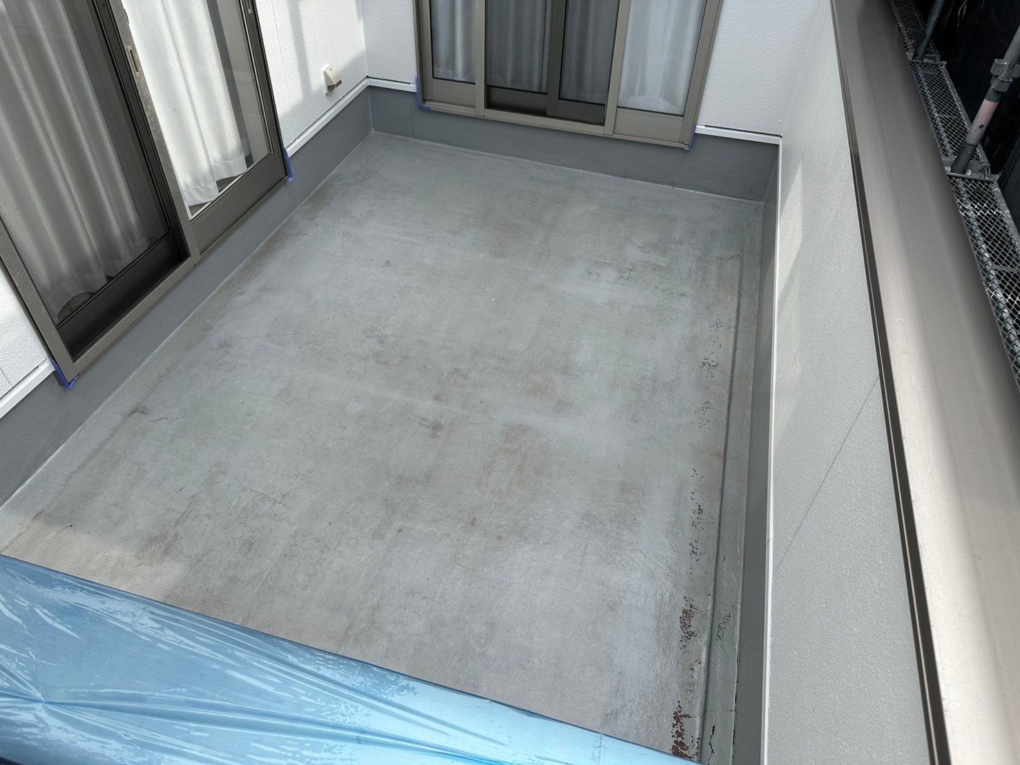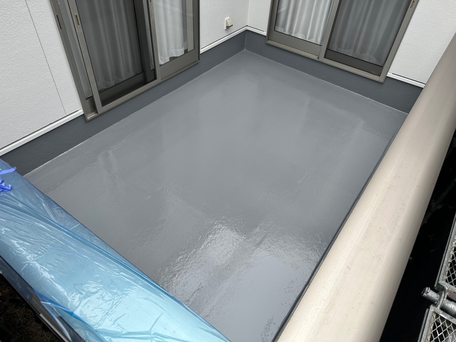 本日の作業は、昨日の続きですがベランダの床と立ち上がり部をオートンウレアックスHGの材料で塗り重ねていきます。プライマーを塗って乾いてから中塗りをしましたが、ややこしい天気なのでTOPコートは止めて明日は、屋根、外壁の最終検査やタッチアップに掃除も残ってますので一緒にしますね。引き続きよろしくお願い致します。