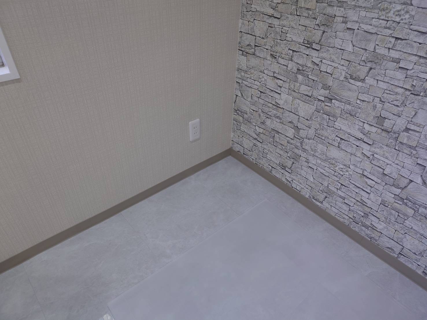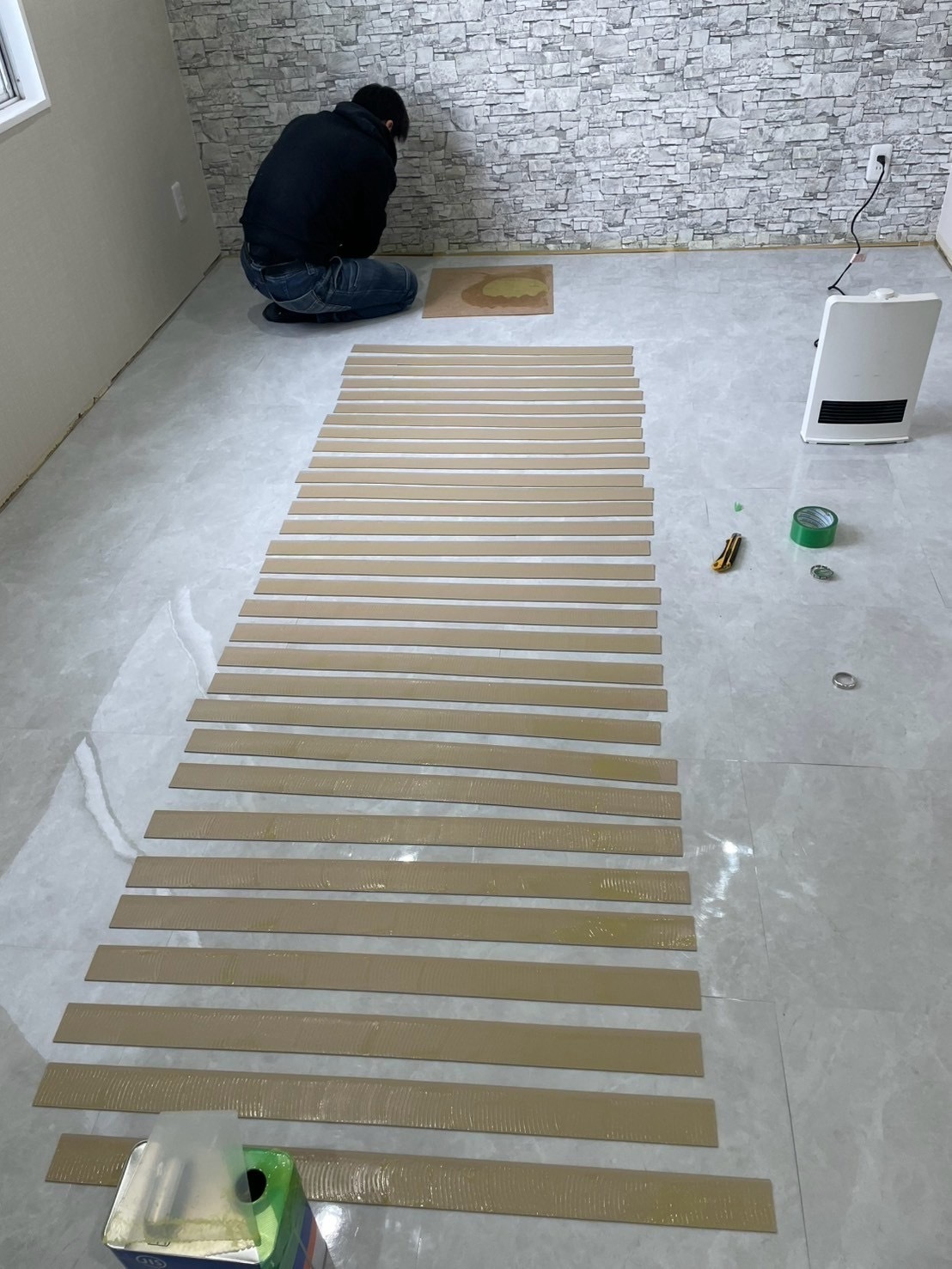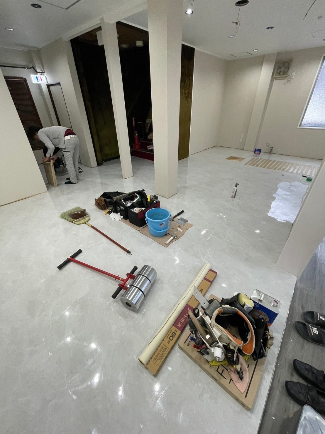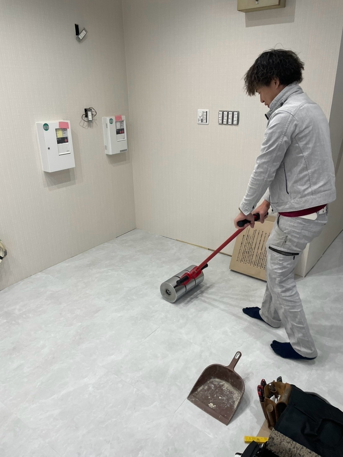 本日の作業は、朝から大理石調のフロアタイルを張ってます。只今床張りが終わりローラーで踏みながら下塗りボンドを締めていっております。次は、壁クロスとフロアタイルの取り合いにソフト巾木を取り付けていきますがまた夜勤の電気工事と一緒にアップしますね。引き続き宜しくお願いしますね(^^)