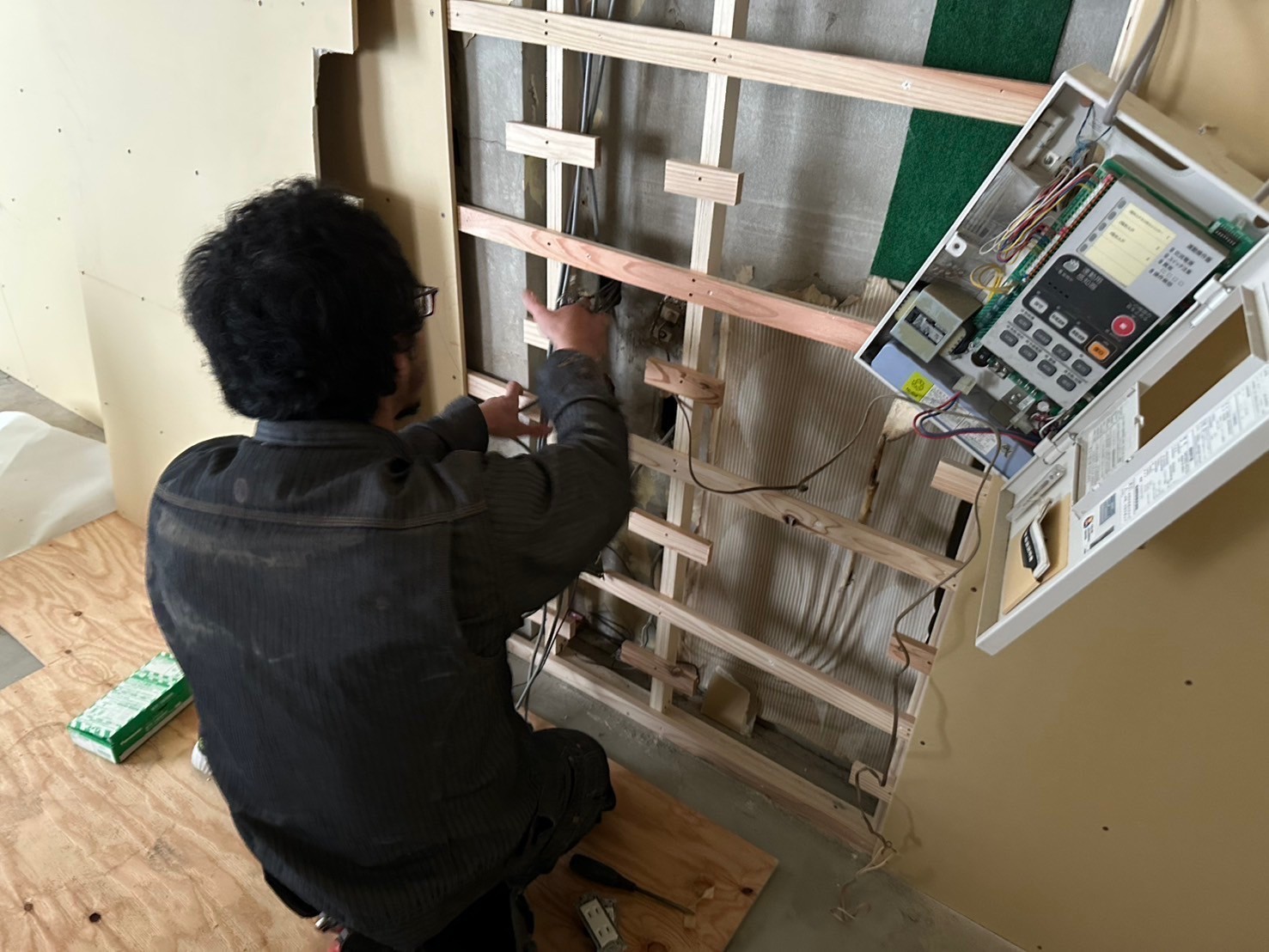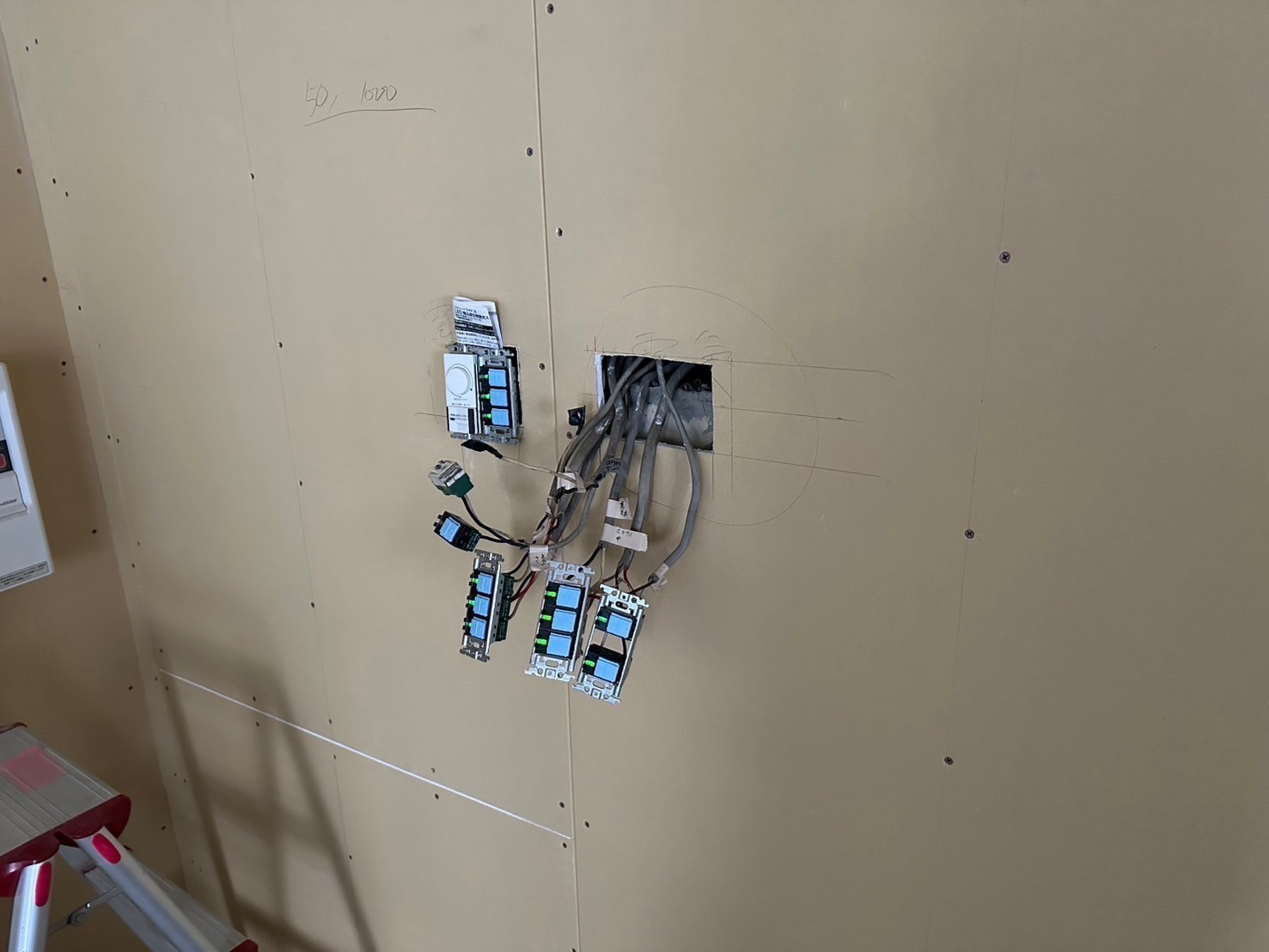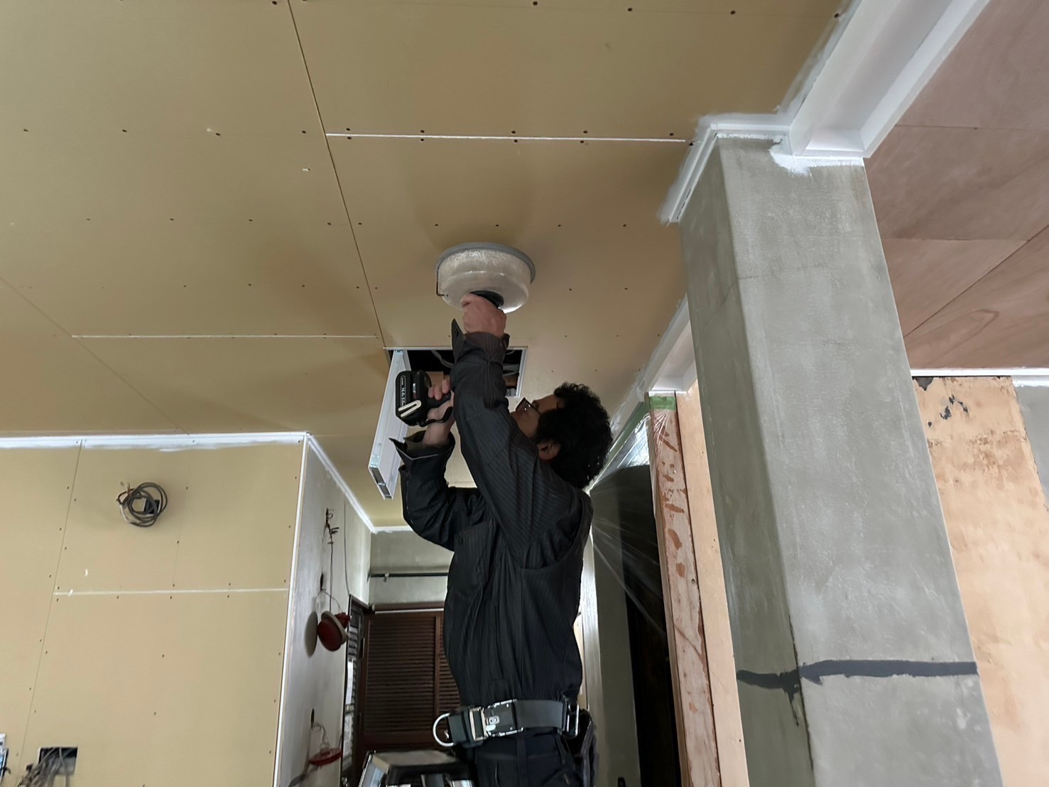 本日の作業は、配線工事とダウンライトを天井に設置するのに位置を決めて穴を開けました。後はダウンライトの器具を取り付けていきますね(^^)またアップしますので引き続きよろしくお願い致します。