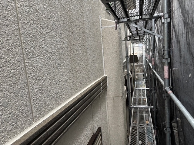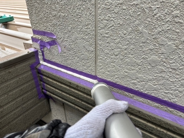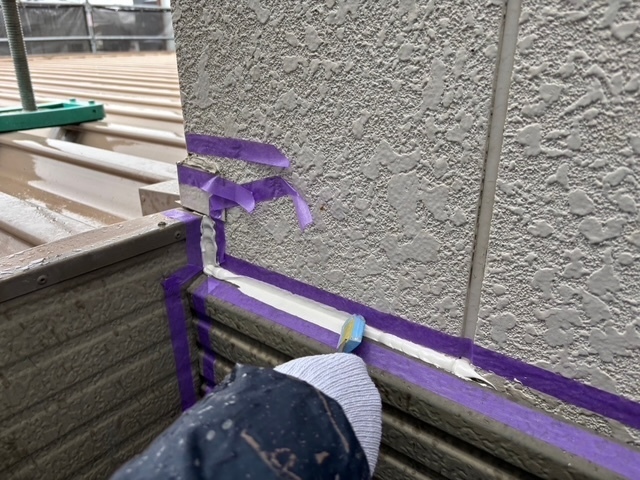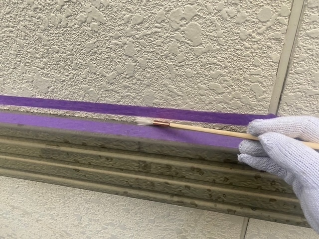 建物が積水ハウスなんで目地部には、ガスケットが取り付けてますのでオートンイクシードで増し打ちをします。シール打設の前に養生テープをしてプライマーを塗って行きますが今日は、雨なんで出来る箇所だけして午前中で上がりました。明日も引き続き宜しくお願いしますね(^^)