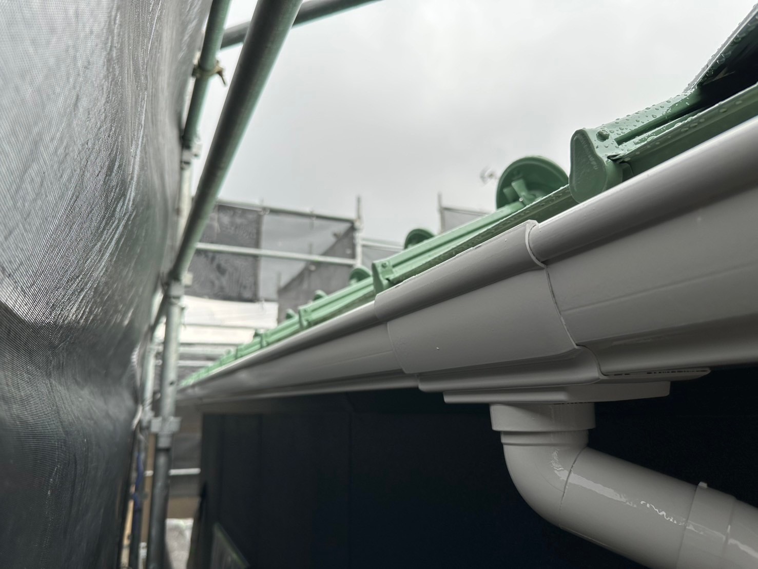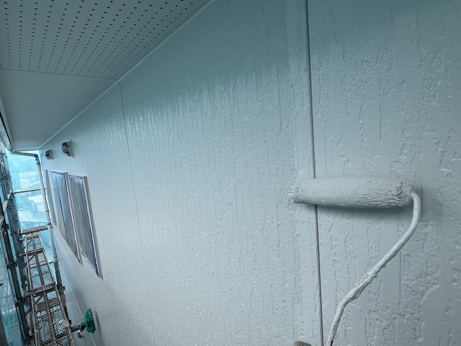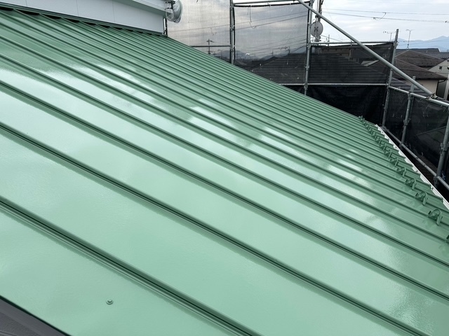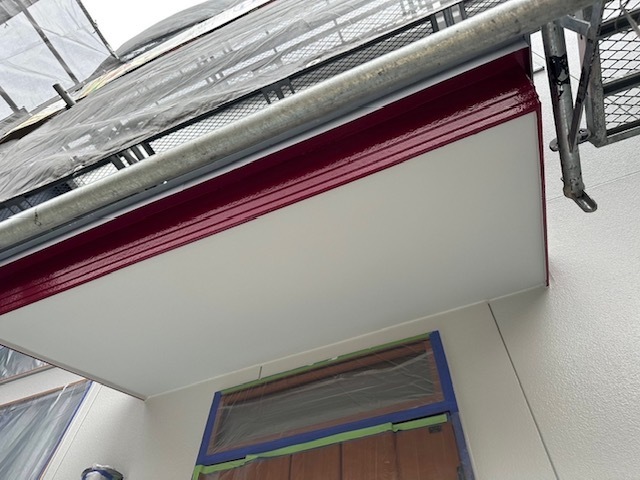 本日の作業は、金属屋根が後もう少しで終わりますが今日の天気は降ったり止んだりでしたので付帯部の塗れそうな箇所を塗り作業しました。明日も引き続き宜しくお願い致します。