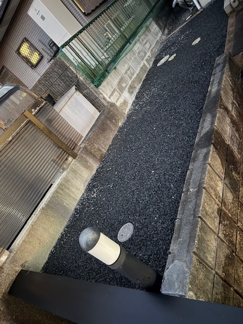 本日の作業はブロック部の水分吸い込み防止で笠木の設置とポスト設置、残りの砂利施工行いました。マス関係の高さ調整など行い整地後、防草シート敷いて砂利施工しました。また最終点検させて頂きます。引き続き宜しくお願いします。
