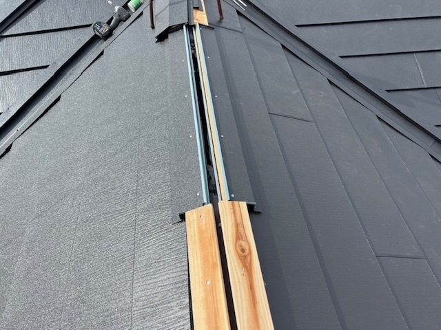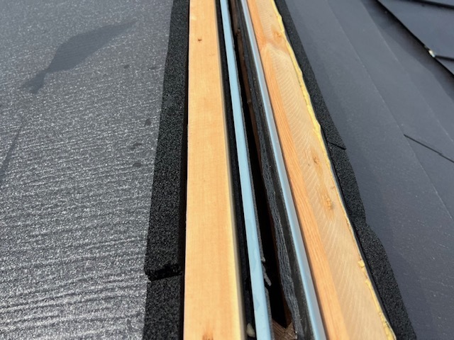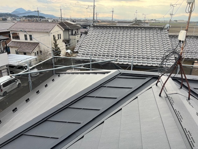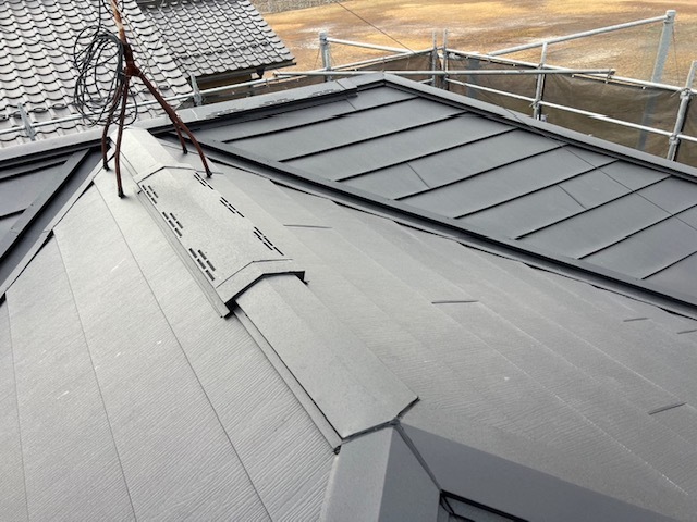 本日の作業は大屋根の棟板金(換気棟含む)アンテナ針金張り直しなど作業進めました。これで大屋根は完成です。残るは下屋根の板金関連と竪樋で作業終了です。玄関上下屋だけ足場解体後に施工します。引き続き宜しくお願いします。またアップします。