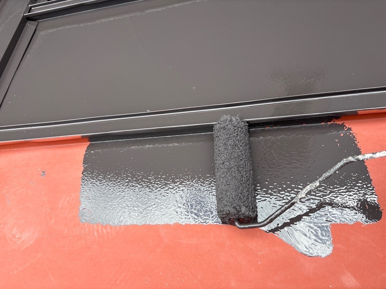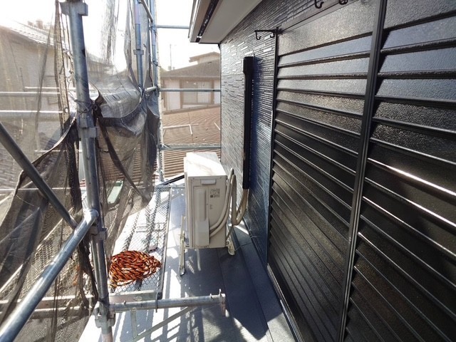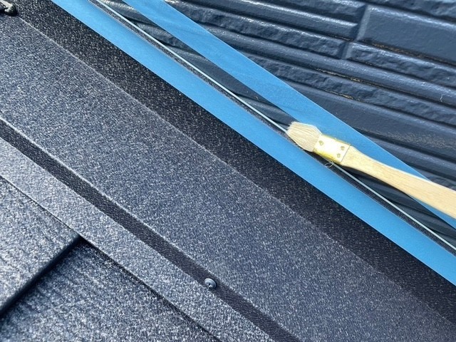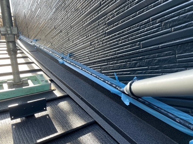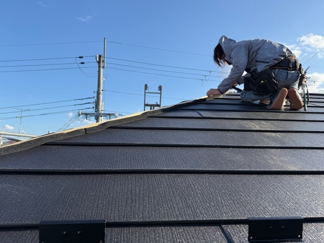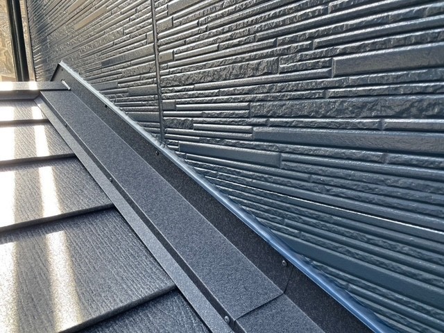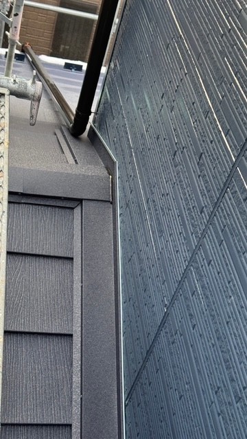 本日の作業は、足場の解体工事前に朝から外壁サイディングと屋根のカバー工法工事に取り付けた水切り板金の取り合いの天端を同色でシール仕上げしました。外壁塗装とガルテクトのカバー工法工事等は、完全に終わりました。ありがとうございました。引き続き宜しくお願い致します。