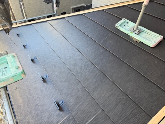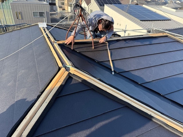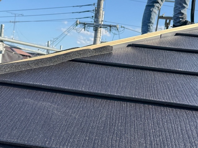 下屋根の本体も葺き終わりましたので今日から残っている棟板金の施工に入っております。板金もしっかり立ち上げてますが棟を設置する前にシーラーと言う面戸のようなスポンジを入れて水が流れた際に板金を越えないようにしっかり雨漏り対策も行っております。引き続き宜しくお願いします。またアップします。