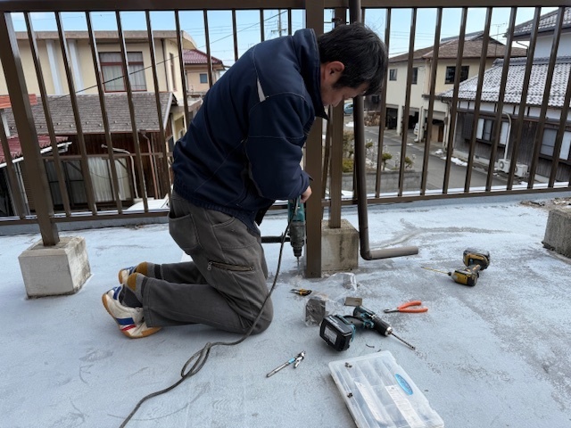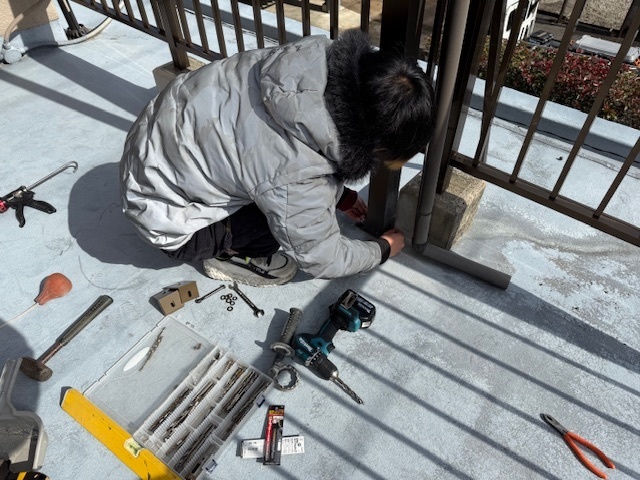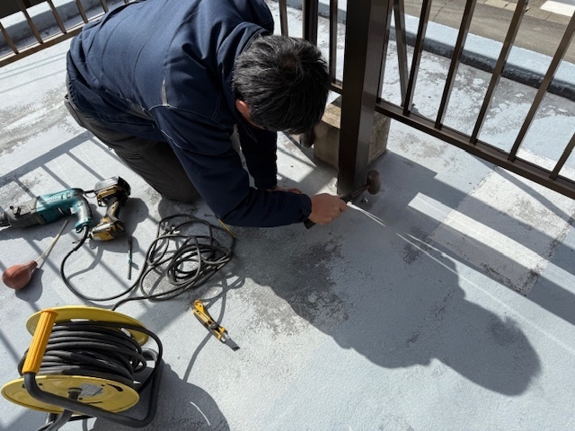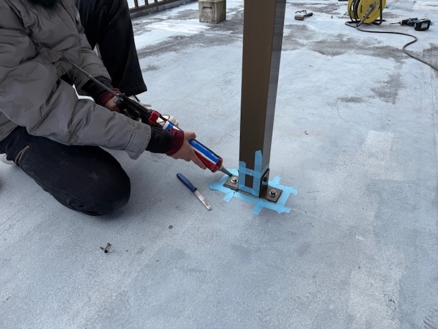 強風の影響でベランダテラスのアンカーが折れてしまい柱がフラフラになっていたので新規でアンカー施工させて頂きました。雨漏り対策としてしっかりボルト部などにもコーキングしました。Tさま大変お世話になり、ありがとうございました。