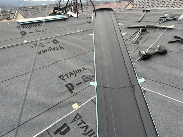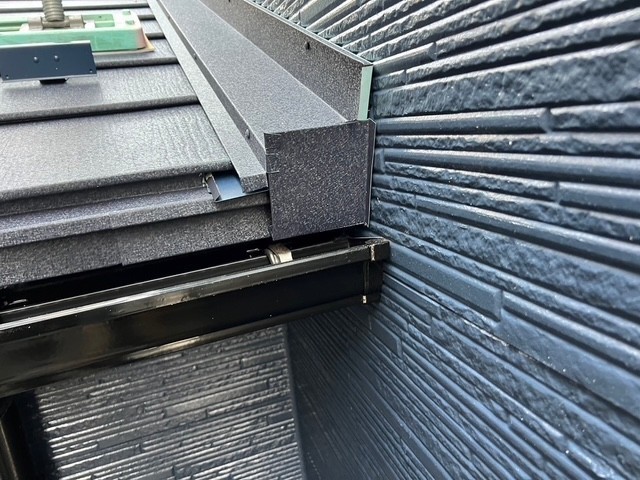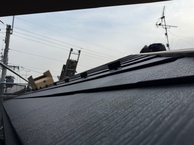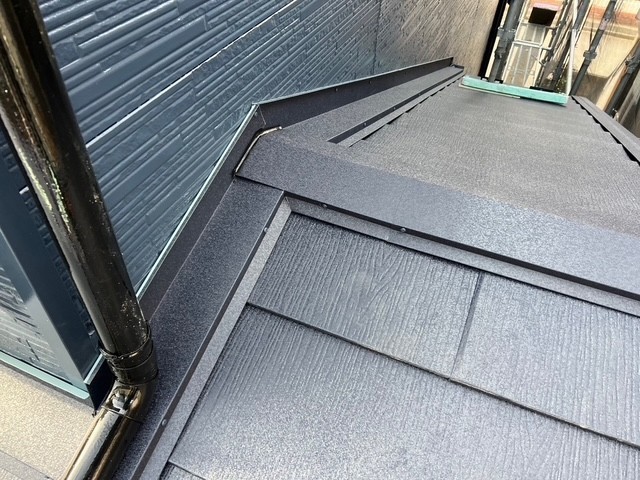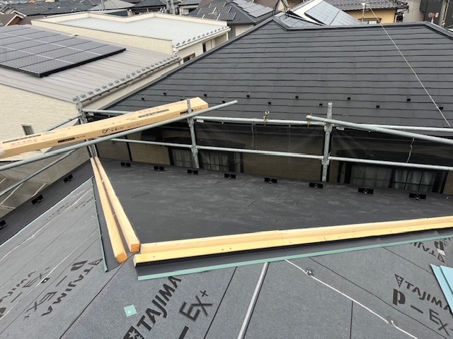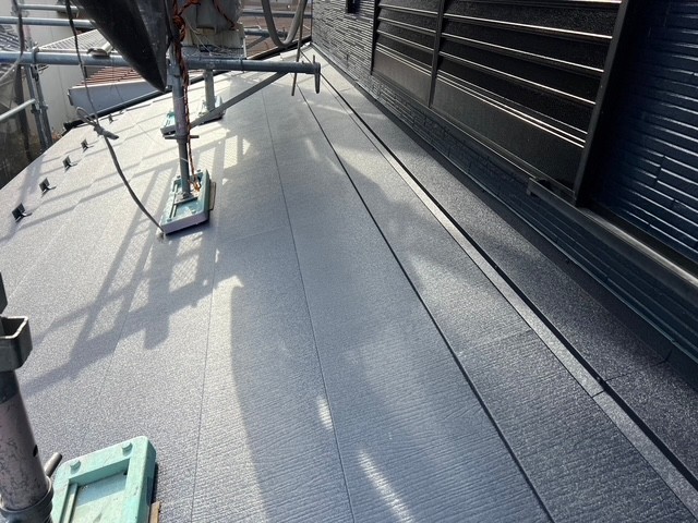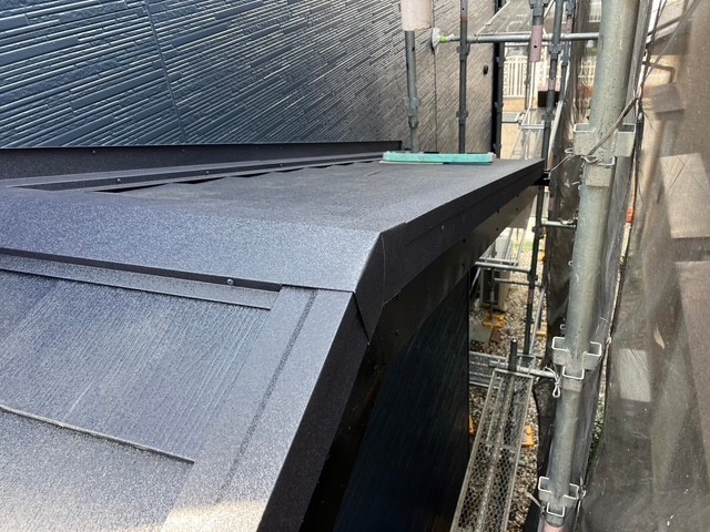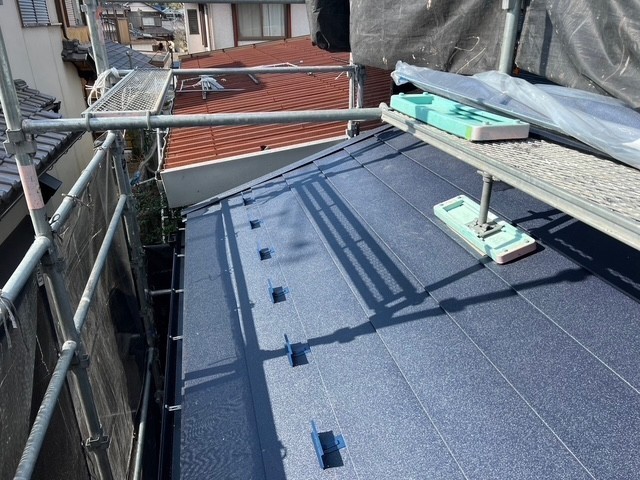 本日の工事作業は、残りの下屋根のガルテクト本体を葺き終わり板金関係は、全て終わりました。後日塗装の検査と一緒にしっかり確認してから足場の解体をして引き続き玄関のドアの取り替え工事や2階のバルコニーの取り付けや外構工事等が残っておりますので引き続き宜しくお願い致します。