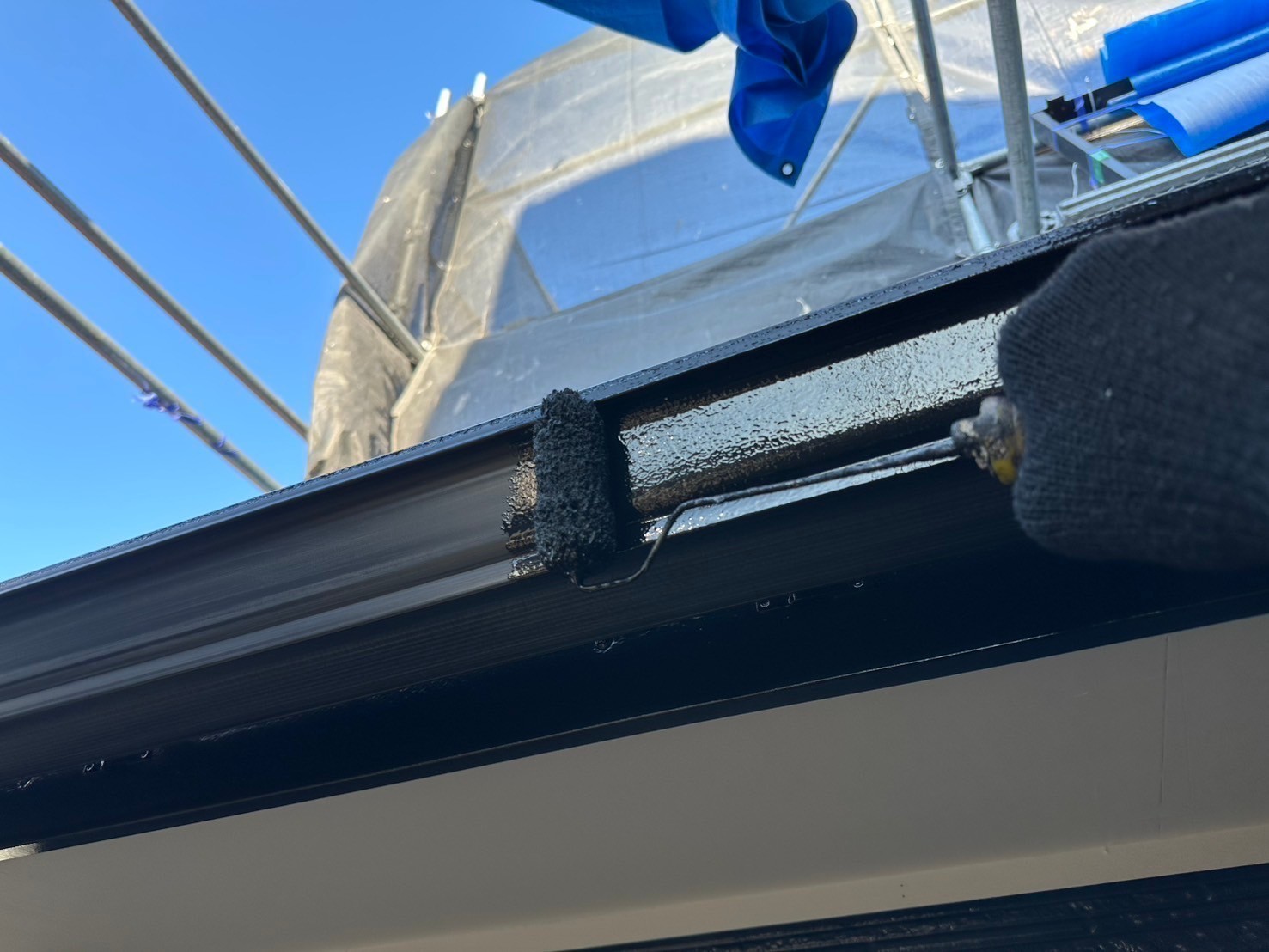 本日も掃除と付帯部の続きの塗装をしました。後は、板金部隊に張り替えてもらう箇所と金属ルーフの箇所を待ってる空き時間に付帯部の続きをしっかり塗装していきますね。(^^)引き続き宜しくお願い致します。