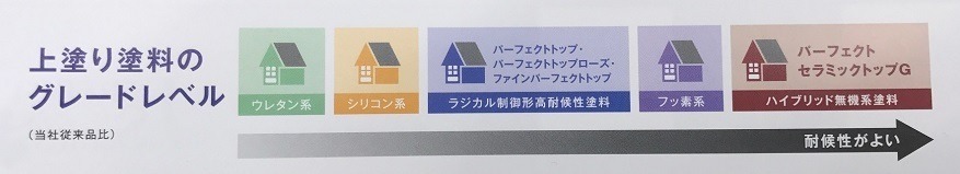 無機塗装パーフェクトセラミックトップG(パーフェクトシリーズの最高峰)は水系塗料なのです。耐候性比較表ではフッソ(4Fセラミック)より上の扱いです。