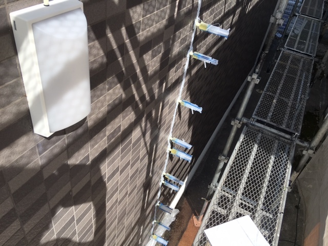 タイル面にクラック(ひび割れ)が入っていた為、エポキシ注入でクラックを補修している写真です。