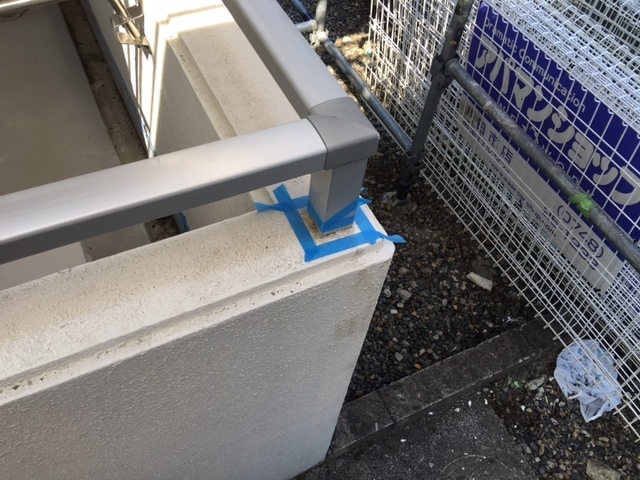 外壁吹付面の伸縮目地シーリング作業です。アルミ手摺りまわりも丁寧にやります。