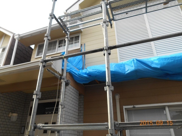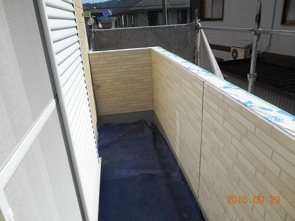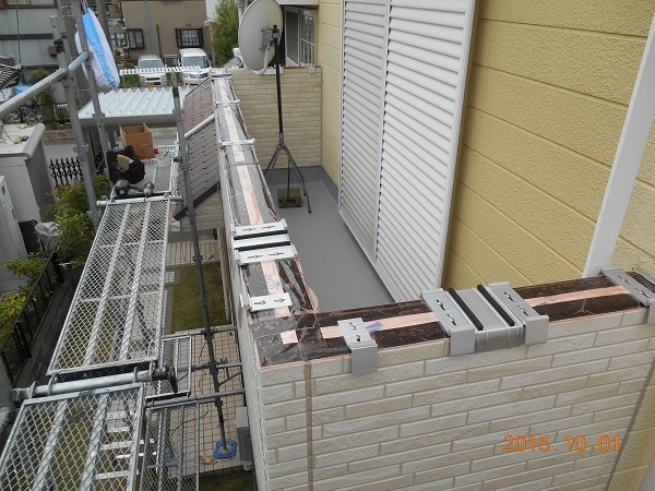 【18】サイディング目地には専用シーリングを打ちます。ベランダ笠木はアルミ笠木を取付ます。写真はブラケットを取付しているところ。