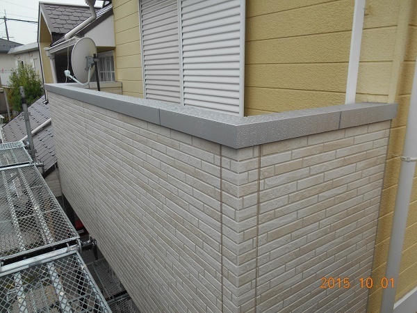 アルミ笠木の上のブツブツは水滴です。(撮影日が雨の日でしたので)実は、解体後にアルミ製バルコニーを取付する案もでましたが、強度・見た目ともコチラにして正解でした。予算もアルミ製バルコニーと、ほぼ変わらない工事価格で出来ました。