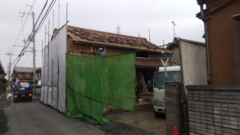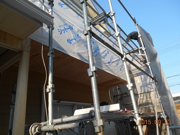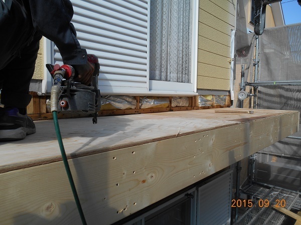 【08】ルーフィング(防水シート)はLEVO1を使います。とても頑丈でこれをはると雨漏りも心配しなくていいです。玄関の軒裏まで腐食していました。