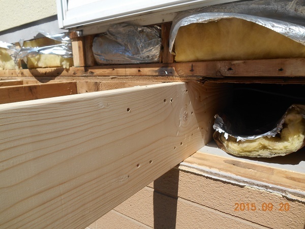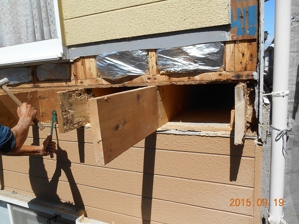 【03】外壁サイディング・軒裏ボードをメクると木部が腐食していました。ベランダに雨水が侵入し、木部が水を含み腐食していました。さらに、シロアリの被害もあり、かなり腐食が進行していました。