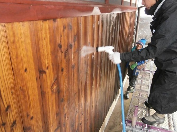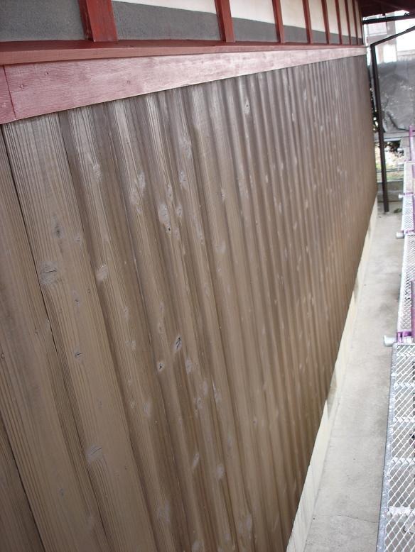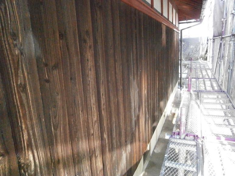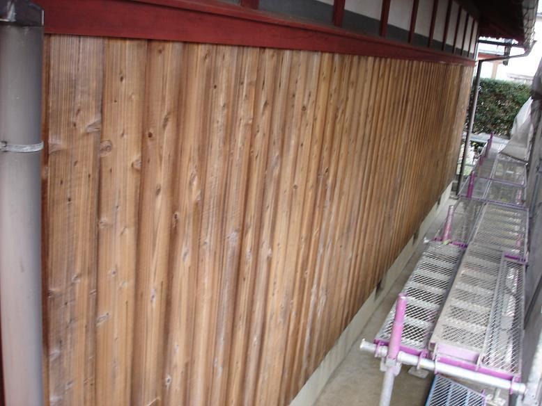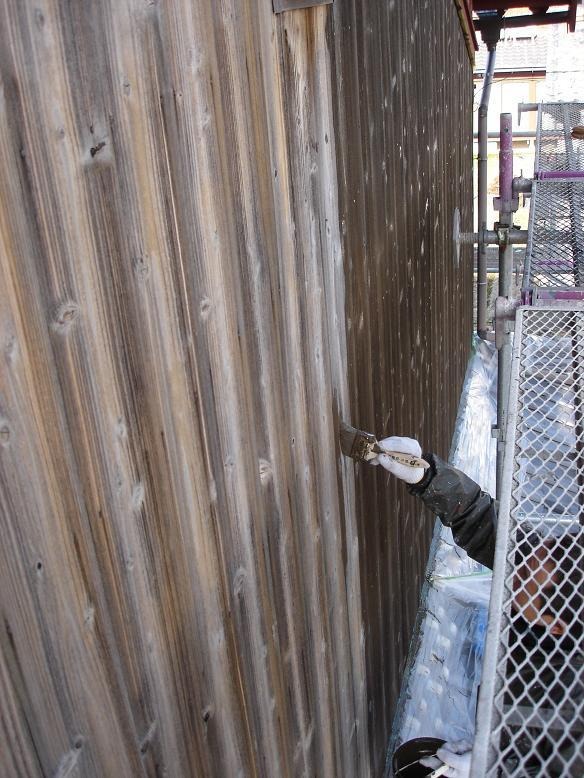 木部の状態がよければ、1回塗りでOKの場合も確かにありますが、古い杉板は吸い込みムラがありますので、2回塗りは必ず行います。