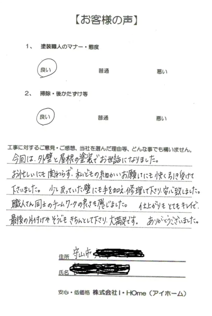 外壁塗装を何年も前から考えておりましたが、アイ・ホームさんとご縁があり、やって良かったと思ってます。親切で丁寧な仕事で職人さんのマナーも感謝しています。