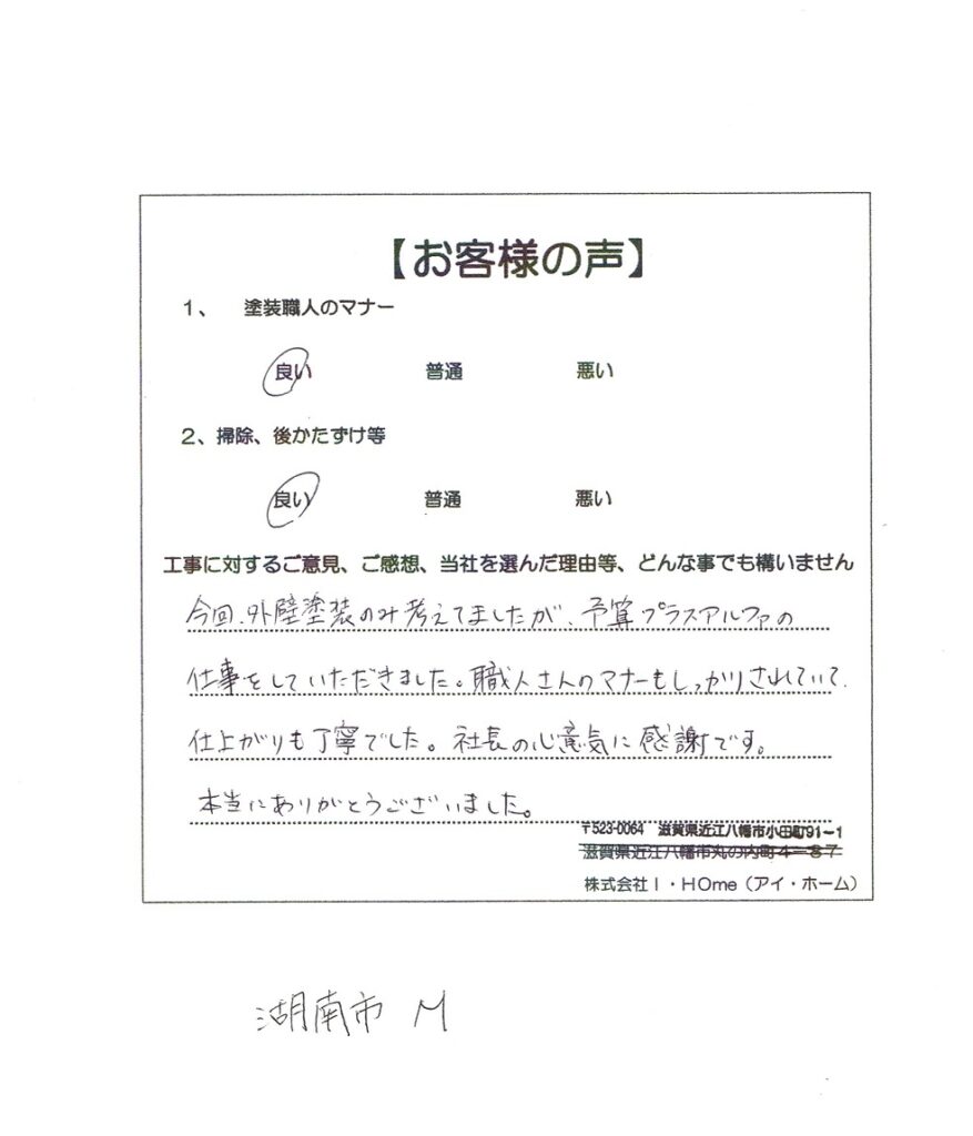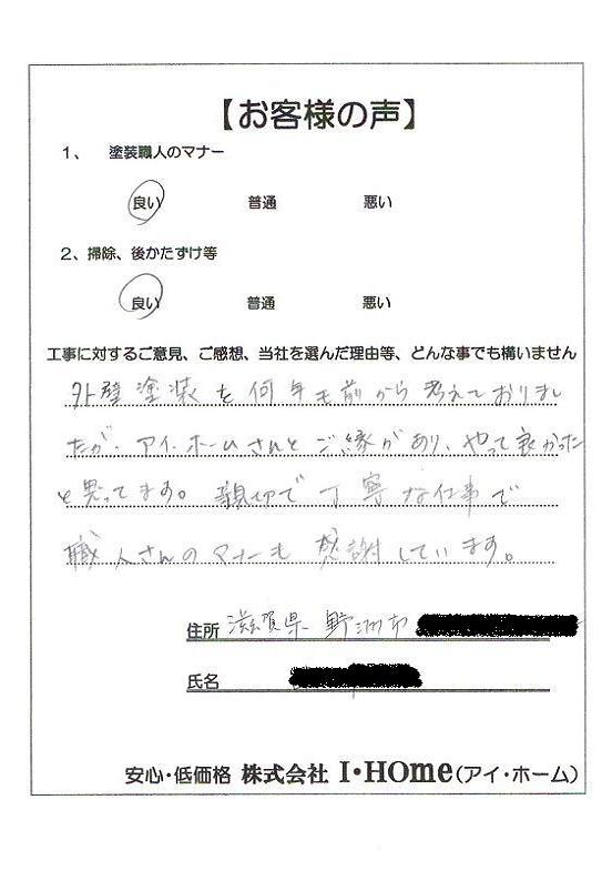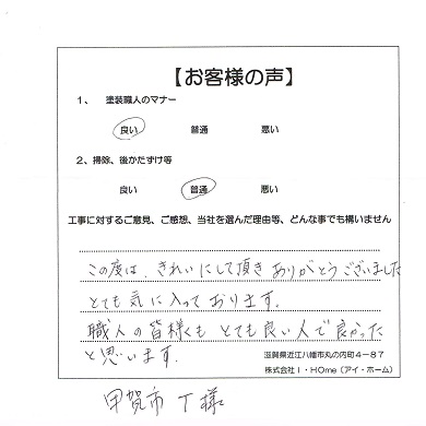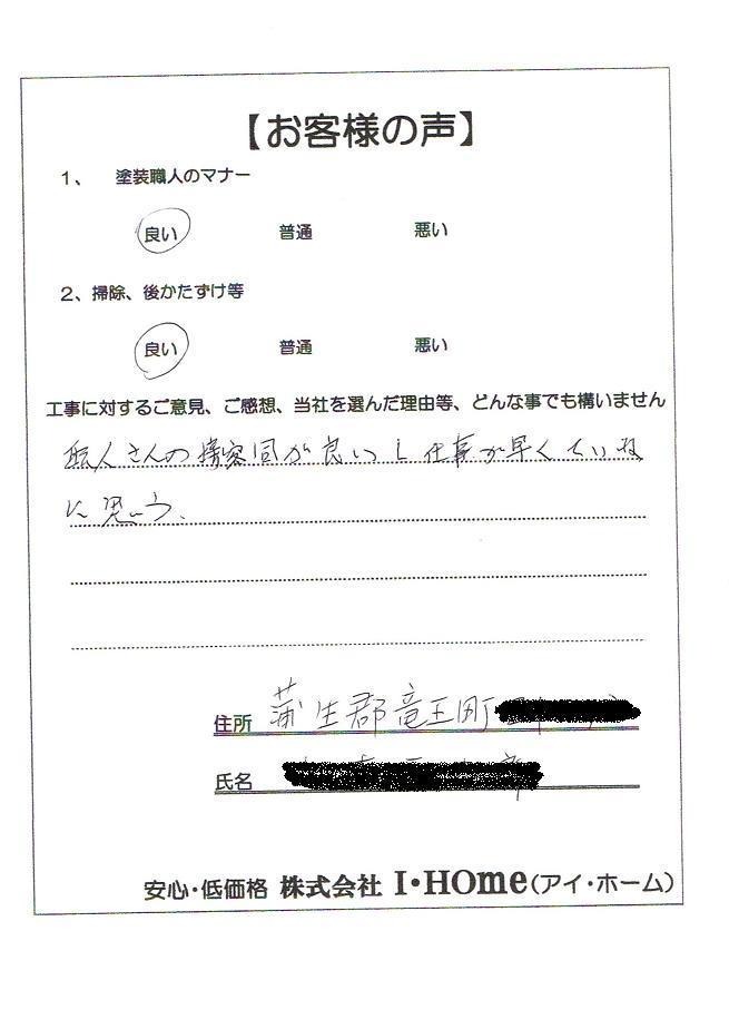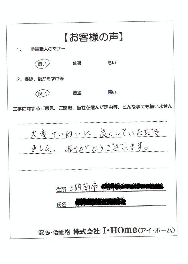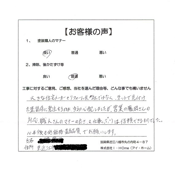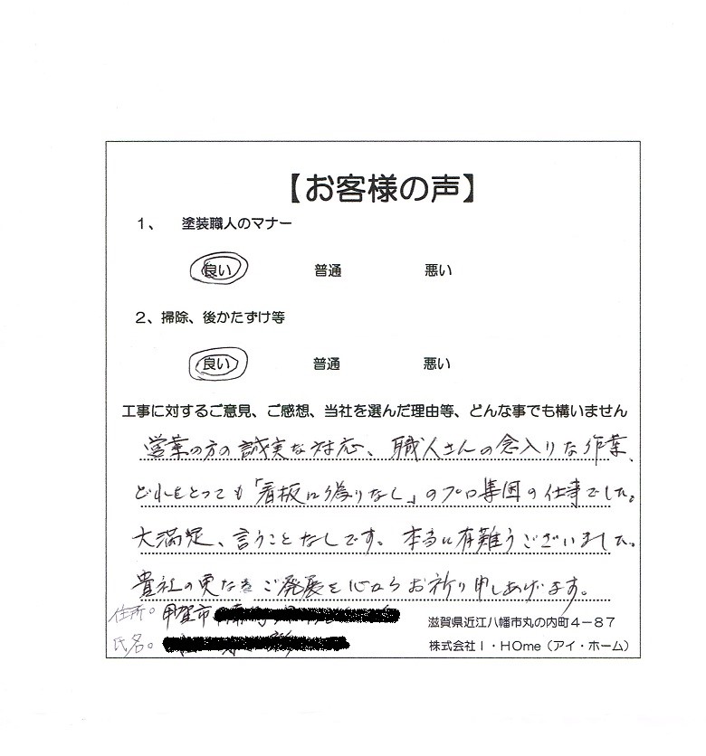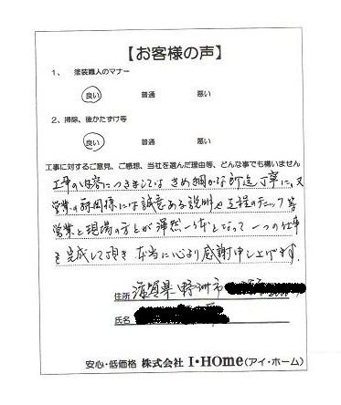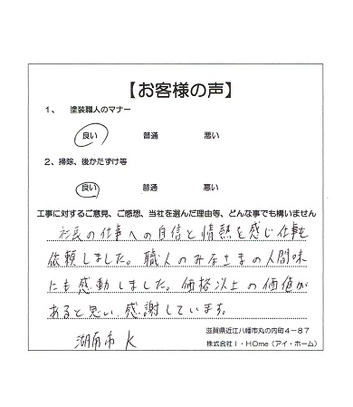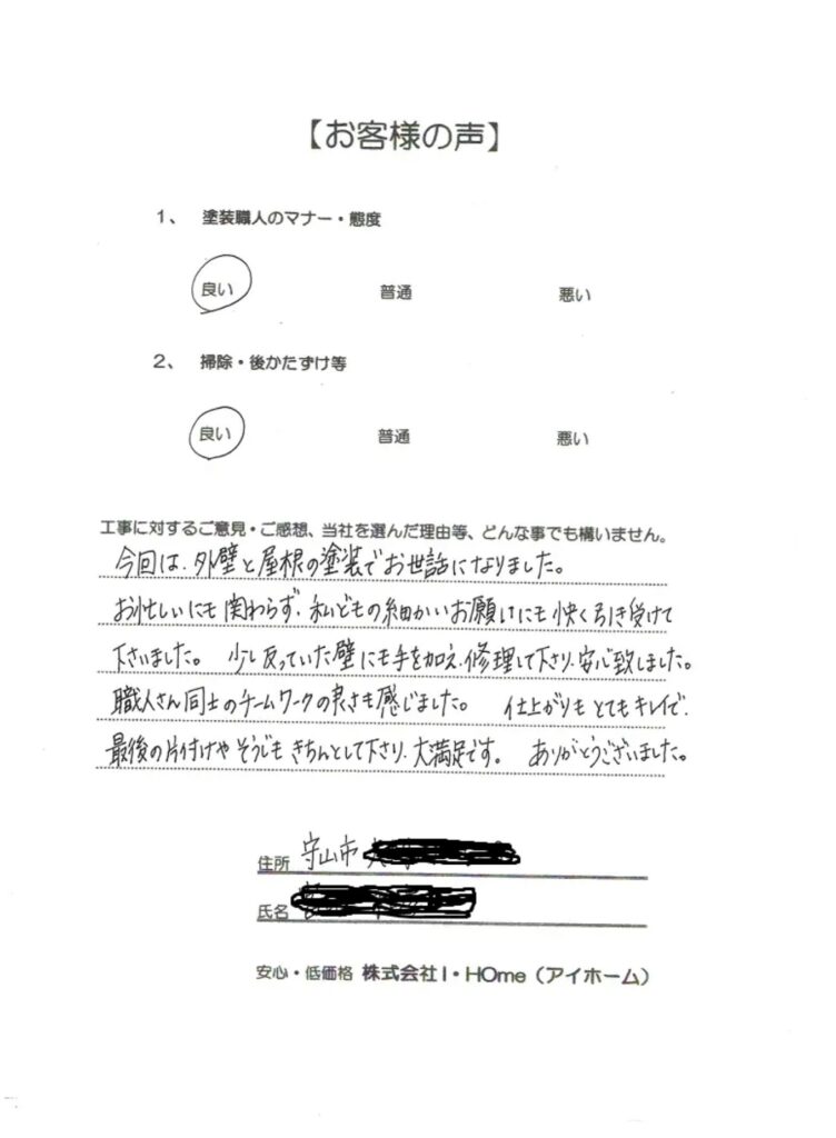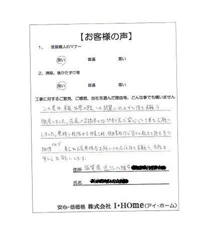 ホームページでI・HOmeさんを知り、藤岡さんと出会い印象通りの会社であり、御社に塗装をお願いする事に決めました。工事が始まり、どんなお願い事も笑顔で答えてくれるスタッフに好印象を受けました。品質重視での作業には安心感がありました。親切・丁寧・笑顔のイメージを受けました。その代表者が高畑さんだと妻と話しています。社長もお客の声には耳を傾け対応される方で、又、気さくな人柄にはプライベートな会話も盛り上がりました。